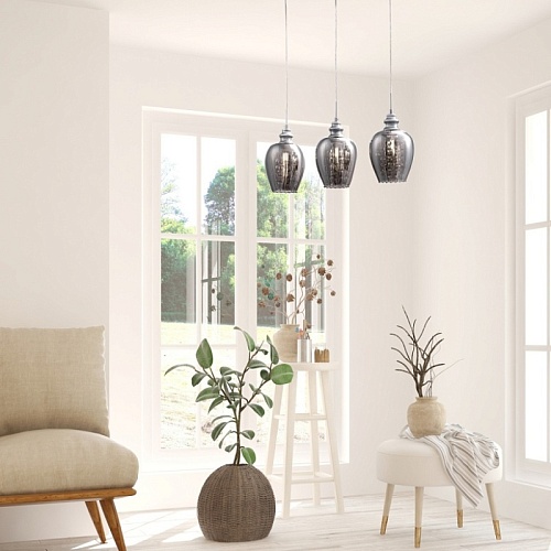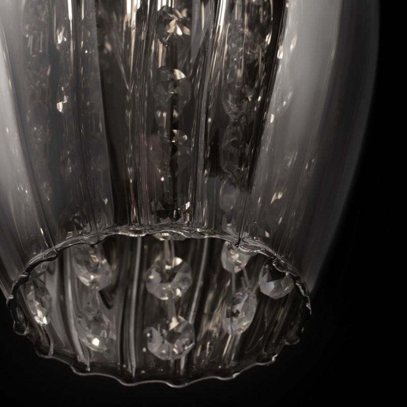 Небольшие светильники с характерными чертами в конструкции станут изюминкой любого интерьера. Изысканная форма стеклянных плафонов сочетается с элегантными подвесками из кристаллов. Свет, отражаясь от тонированной поверхности стеклянной сферы, переливается и играет на их гранях. Арматура сделана из хромированного металла. Высоту подвесных светильников можно отрегулировать длиной шнура.