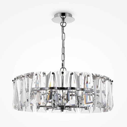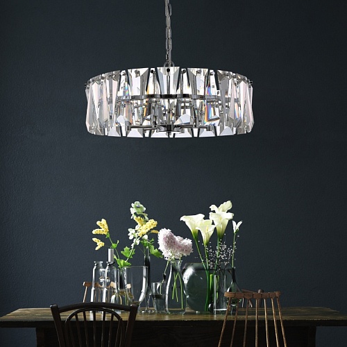Материал арматуры – металл, оттенки – хром и золото. Декор – массивные крис таллы сложной огранки. Высота подвесных моделей регулируется длиной цепи. Источник света - лампа с цоколем Е14.