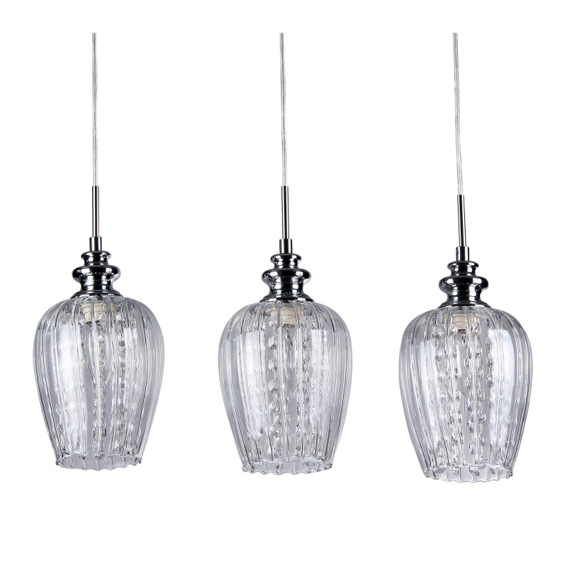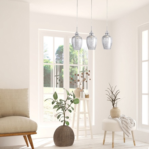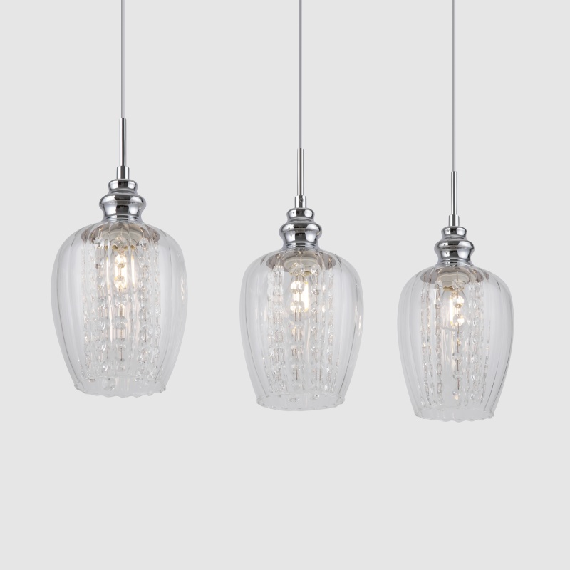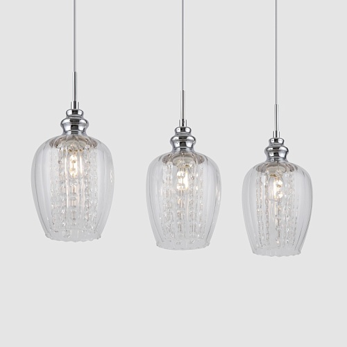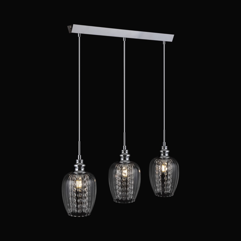 Небольшие светильники с характерными чертами в конструкции станут изюминкой любого интерьера. Изысканная форма стеклянных плафонов сочетается с элегантными подвесками из кристаллов. Свет, отражаясь от тонированной поверхности стеклянной сферы, переливается и играет на их гранях. Арматура сделана из хромированного металла. Высоту подвесных светильников можно отрегулировать длиной шнура.