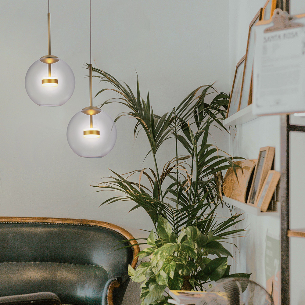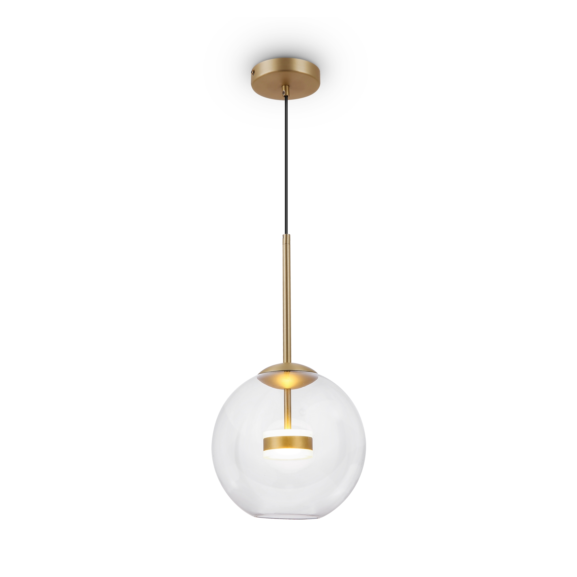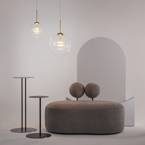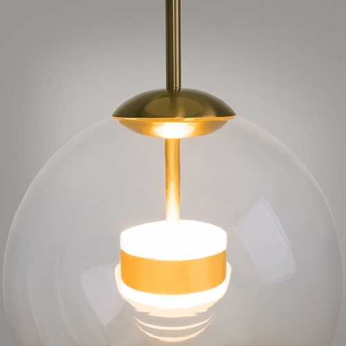 Материал арматуры – металл, цвет – матовое золото. Плафон из прозрачного выдувного стекла. LED-источник света. Регулируемая высота.