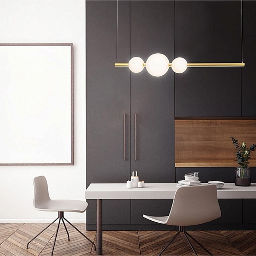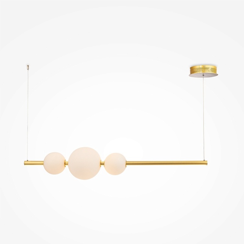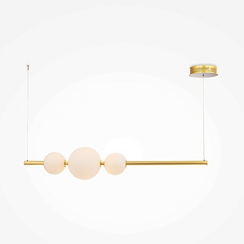 Арматура из металла в золотом цвете. Стеклянные плафоны-сферы бежевого оттенка. Источник света — SMD-светодиоды, интегрированные в каркас светильника. Цветовая температура 3000К. Регулируемая высота.