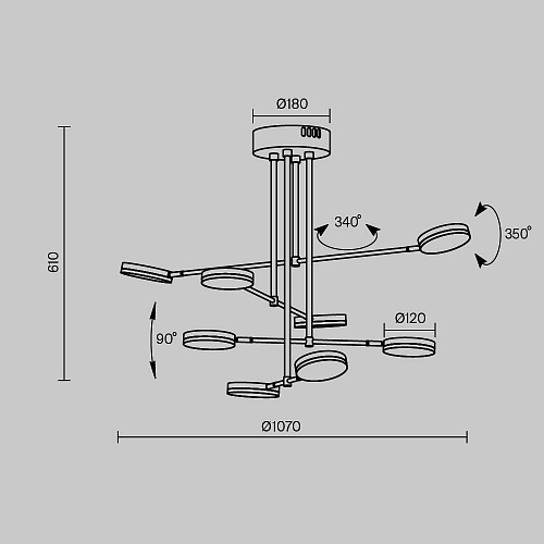 Плафоны и арматура из металла. Цвет рассеивателя — белый, арматура черная или белая. Конструкция предусматривает шарнирный механизм, позволяющий регулировать направление света и высоту светильников. Плафоны вращаются на 90 и 360° (в вертикальной и горизонтальной плоскостях). Угол рассеивания — 120 градусов. Тип света — рассеянный.