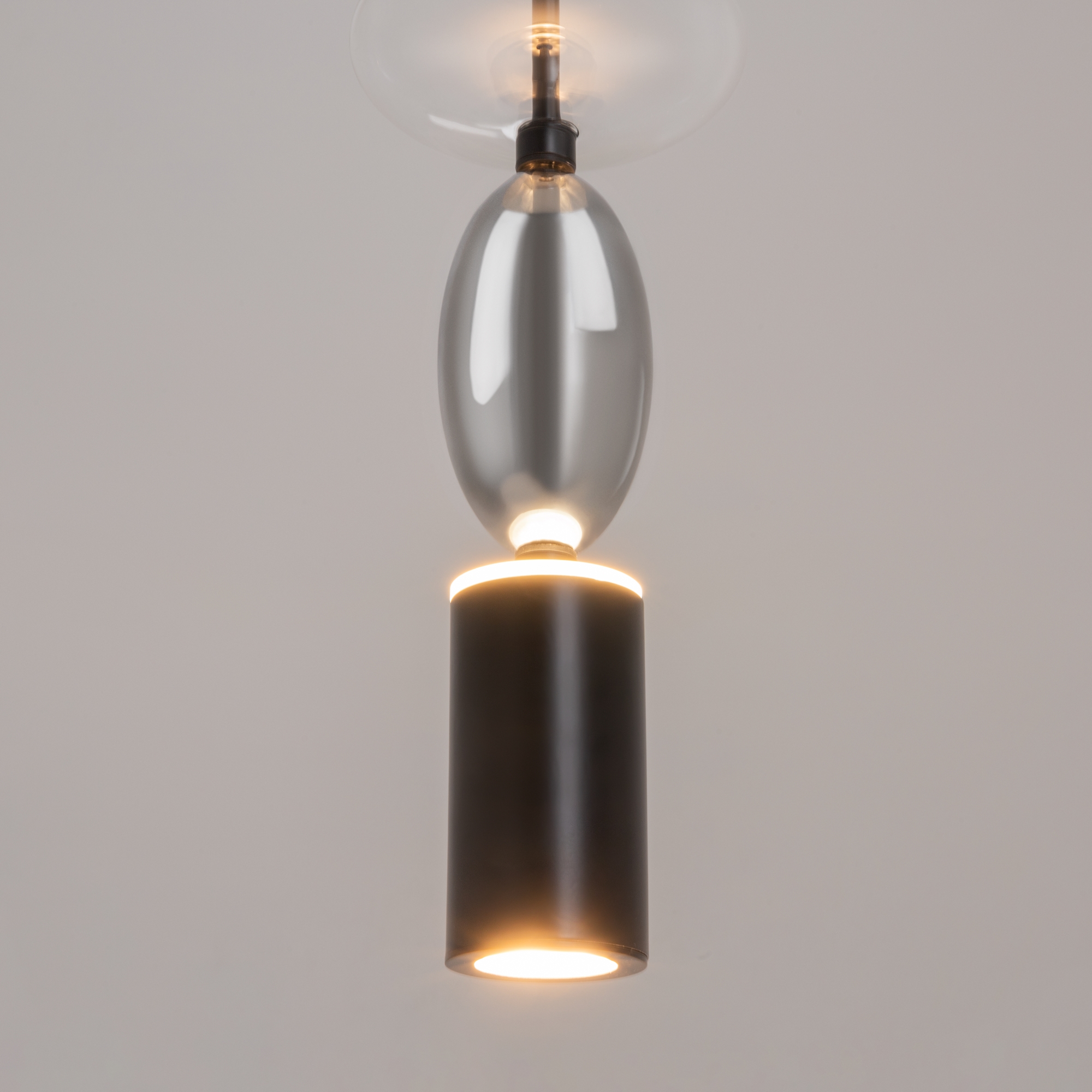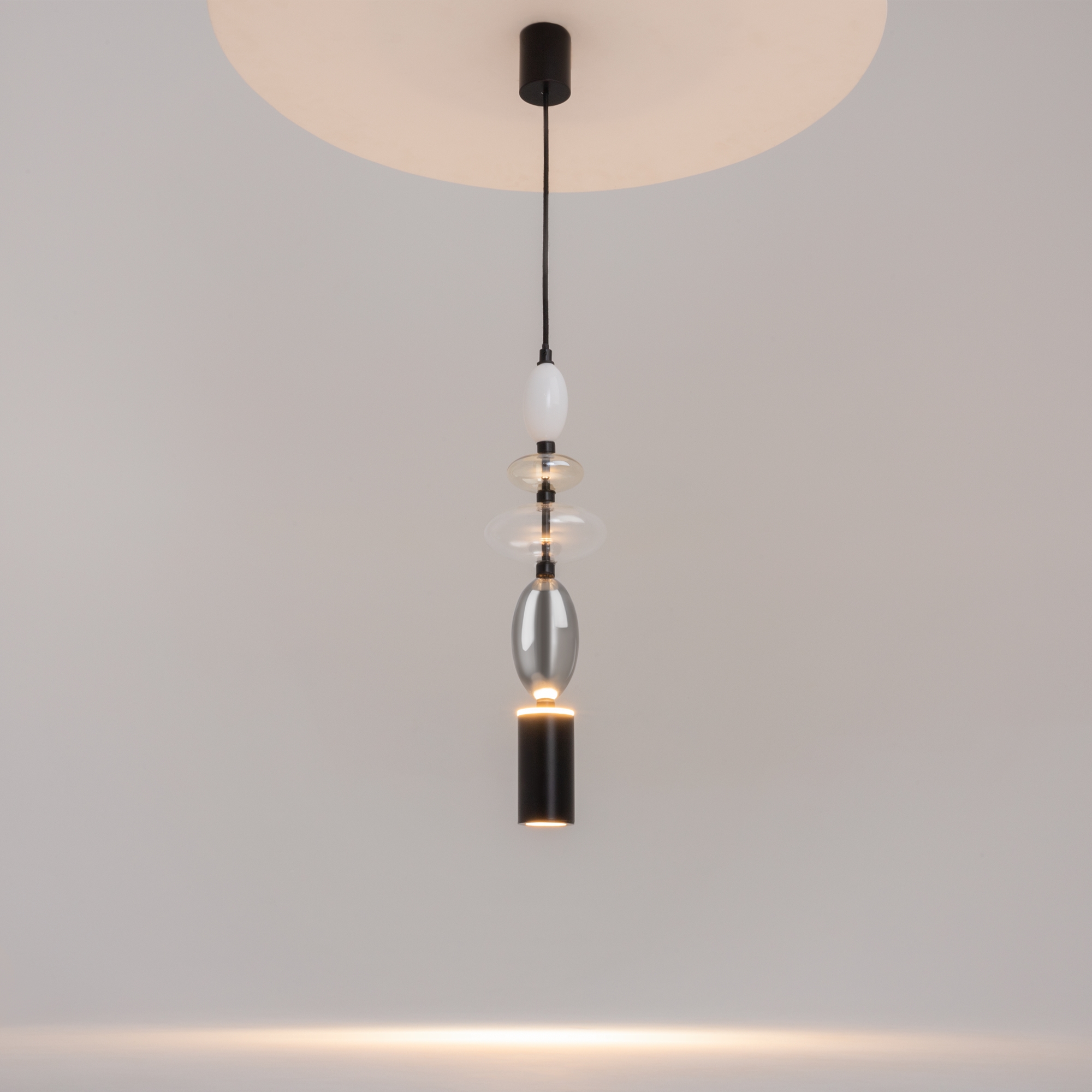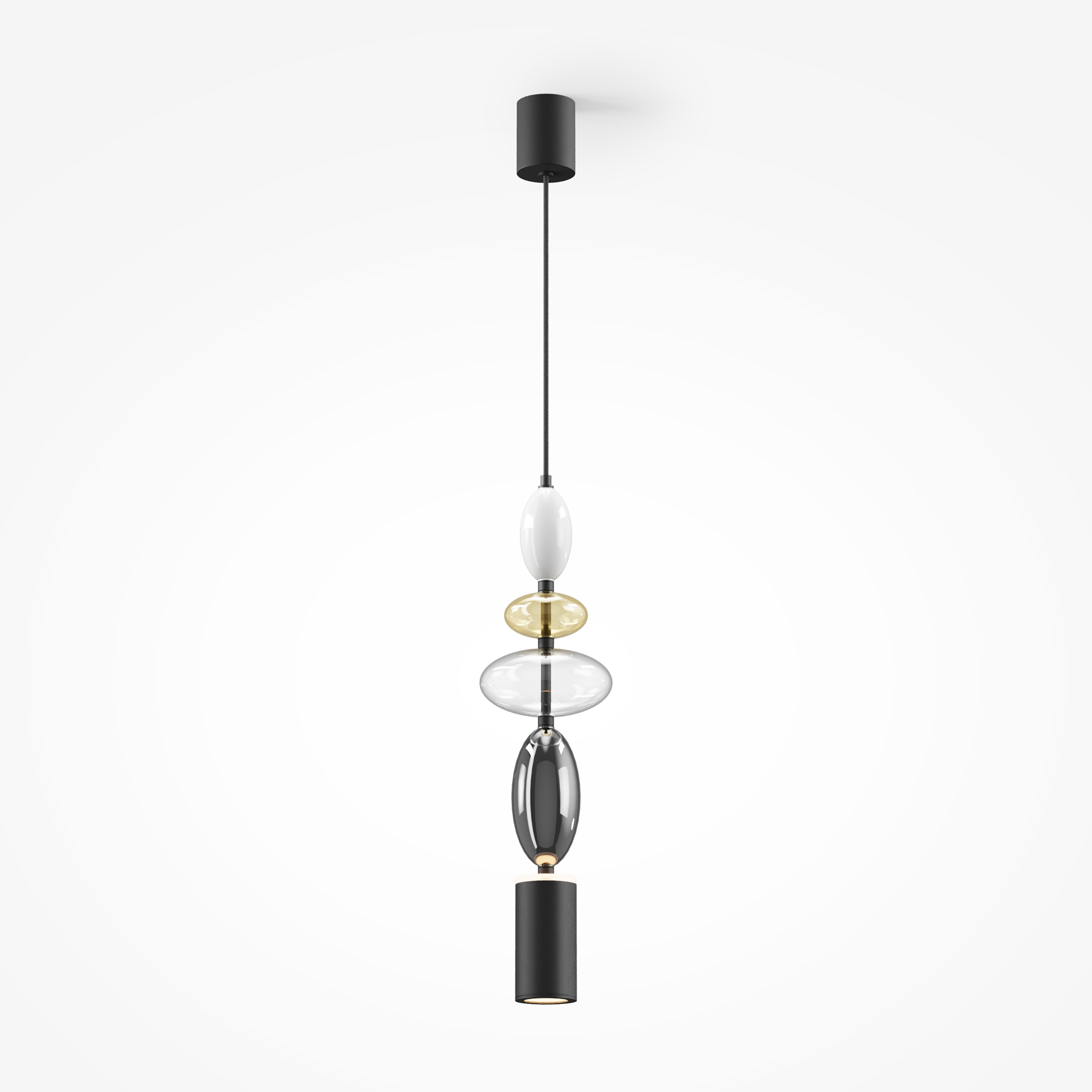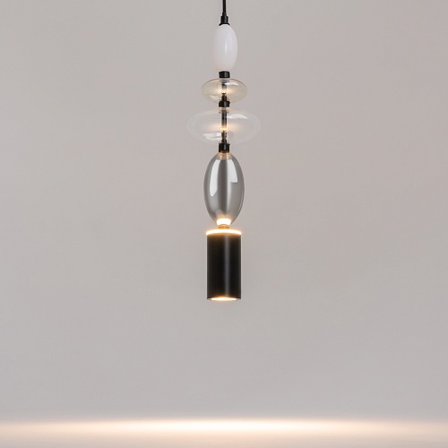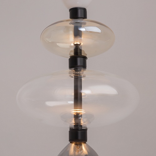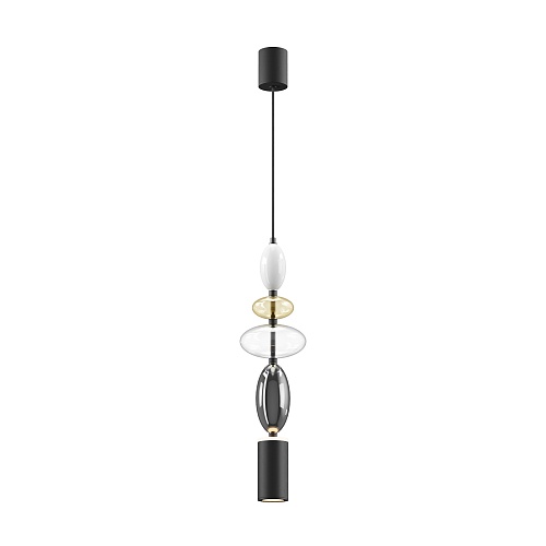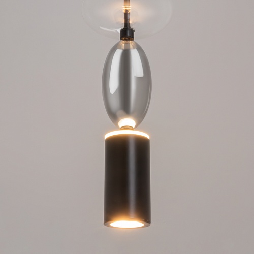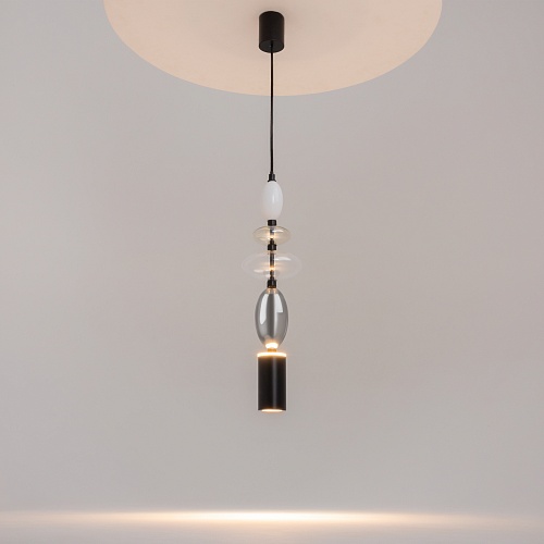 Черная металлическая арматура. Плафоны из стекла коньячного, белого, дымчатого цвета и прозрачный. Источник света комбинированный: нижний - съемная лампа с цоколем GU10, верхний - встроенный LED. Цветовая температура светильников 2700К, угол рассеивания света 120 градусов. Высота регулируется с помощью провода длиной 3 м. Монохромный дизайн, стеклянные элементы впишутся в различные стили интерьеров.