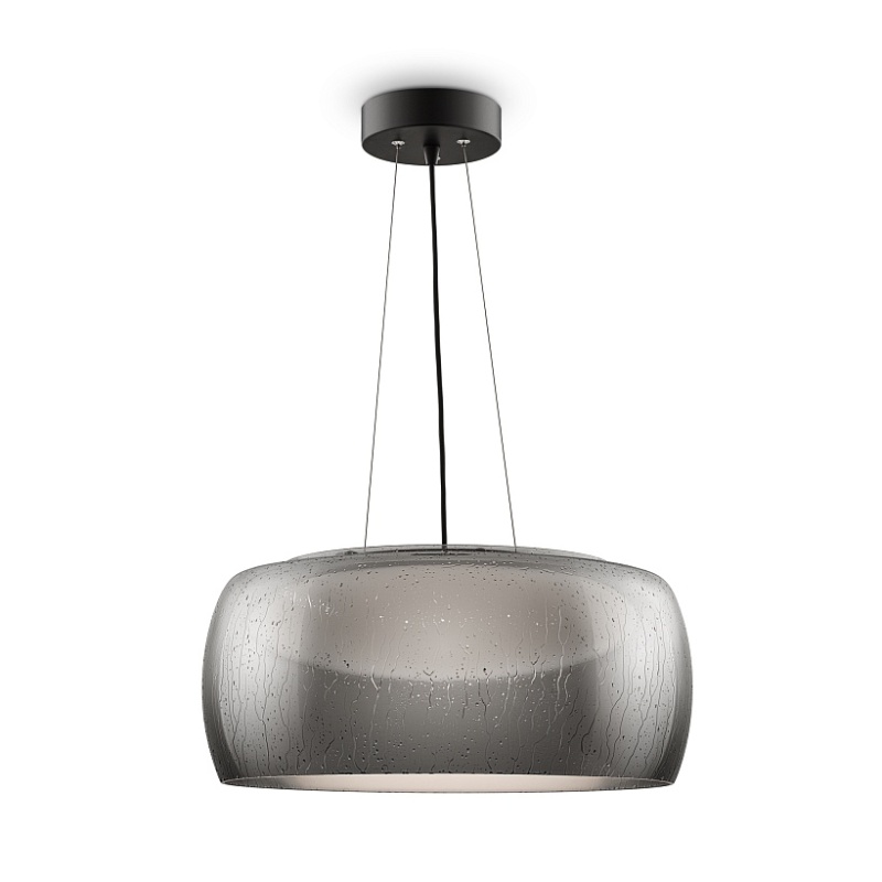 Металлическая арматура в черном цвете. Плафон из выдувного стекла с эффек том дождевых капель. Оттенки плафона: янтарный, дымчатый. Светодиодный источник света скрыт под опаловым рассеивателем. Р
