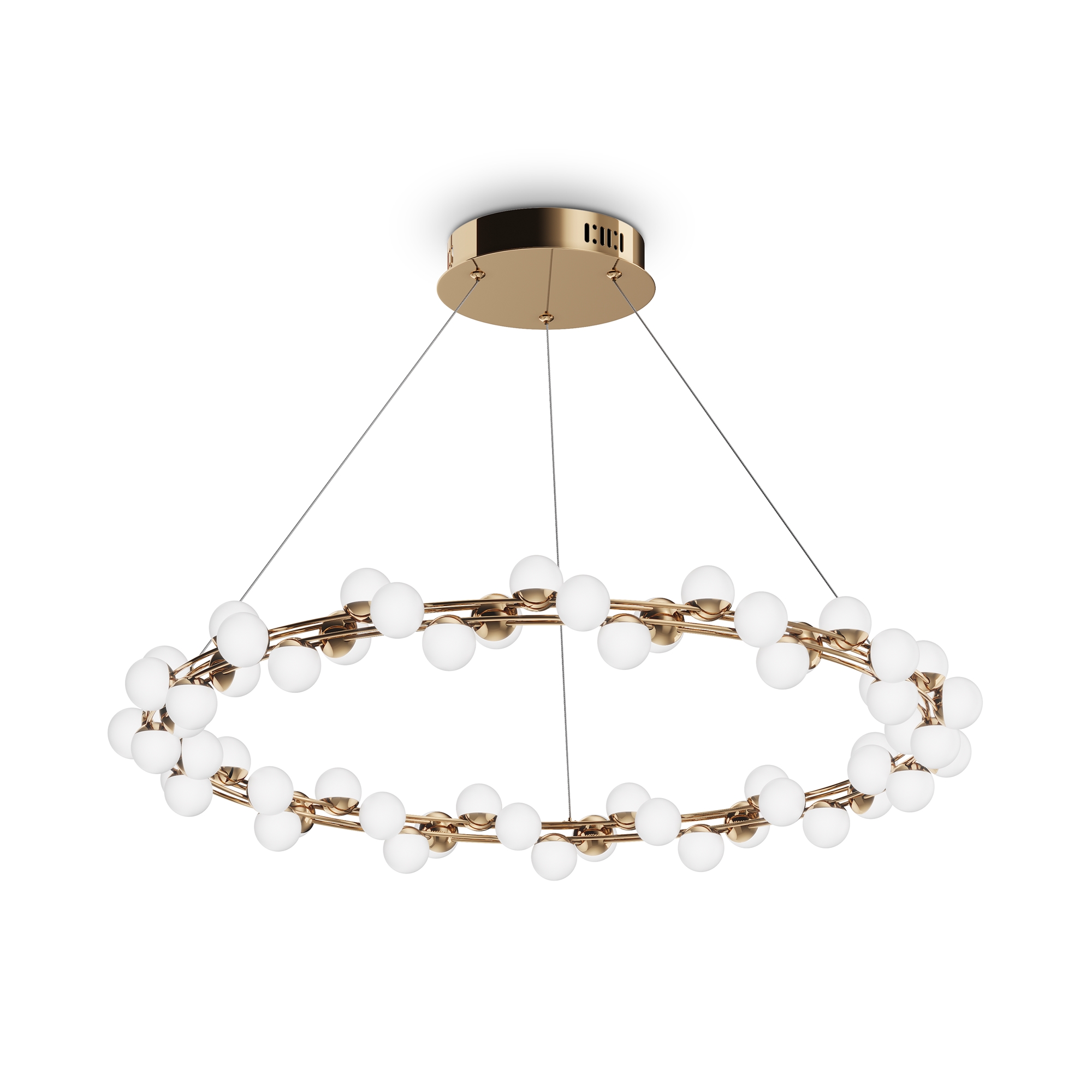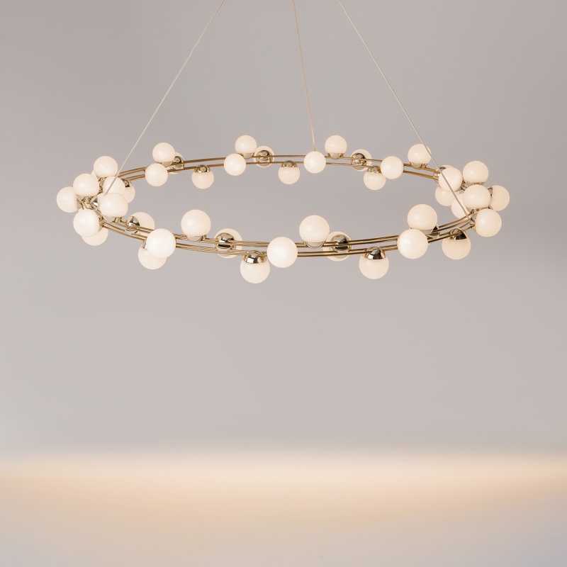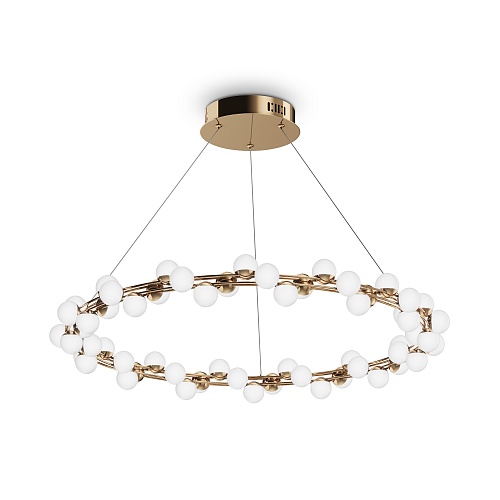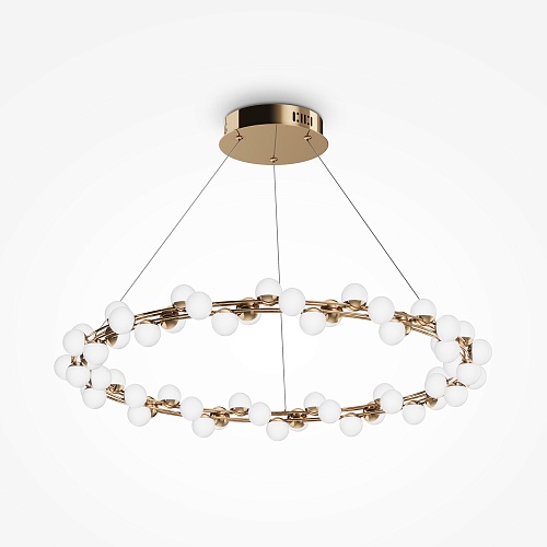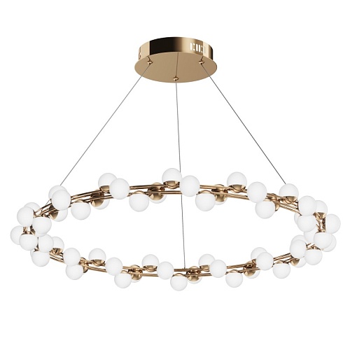 Арматура из металла в золотом цвете. Плафоны-сферы — белый пластик. Дизайн с имитацией молекулярной структуры. LED-источники света.