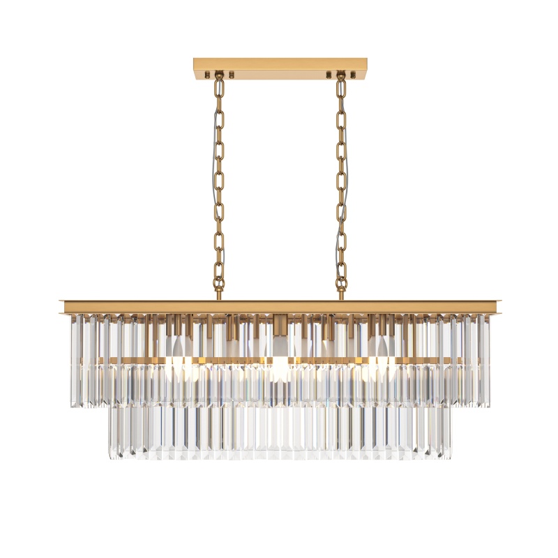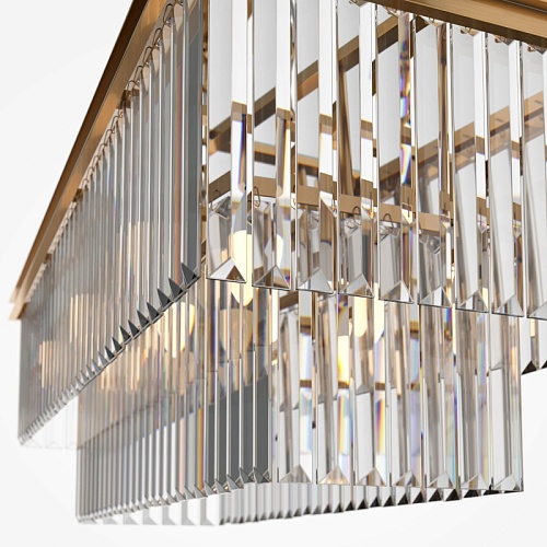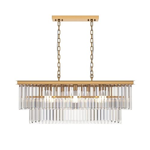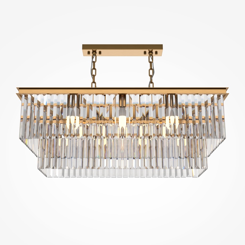 Арматура из металла в трех оттенках: латунь, хром, золото. Многоярусный декор. Подвески: прозрачное (арматура – хром, латунь) и янтарное (арматура – золото) стекло. Высота подвесных моделей регулируется.