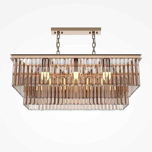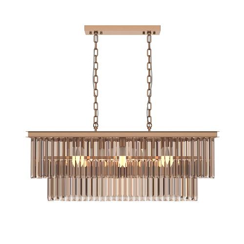 Арматура из металла в трех оттенках: латунь, хром, золото. Многоярусный декор. Подвески: прозрачное (арматура – хром, латунь) и янтарное (арматура – золото) стекло. Высота подвесных моделей регулируется.