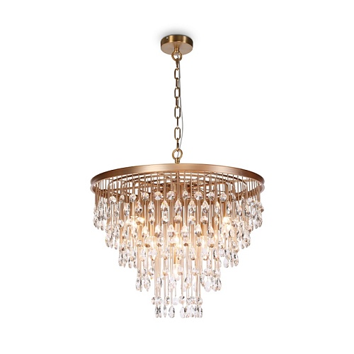 Материал арматуры – металл, оттенки – золото и хром. Комбинация металла и хрусталя в декоре. Металлические трубки гальванизированы в тон арматуре. Хрустальные подвески обрамляют композицию. Высота люстр регулируется с помощью цепи. Цоколь Е14.