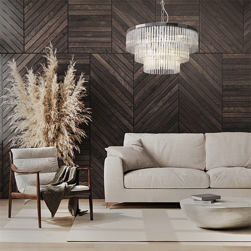 Металлическая арматура в двух оттенках: хром и латунь. Декоративные эле менты – прозрачные стеклянные трубки в форме звезд. Многоярусный декор обеспечивает игру света.