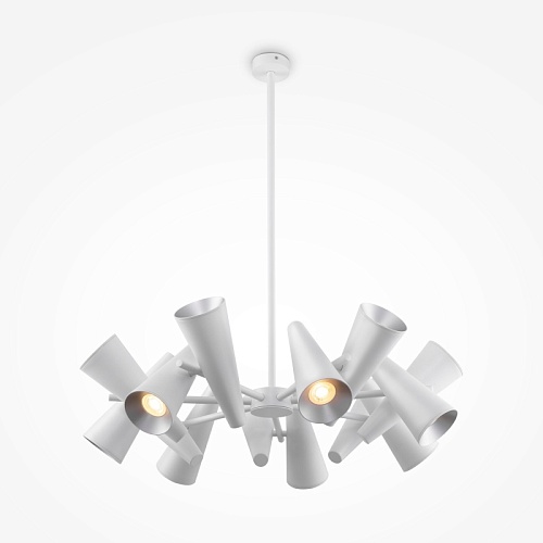 Металлическая арматура в двух оттенках: белый и черный. Плафоны-конусы выполнены из алюминия. Оттенки: белый, латунь. Рожки вращаются, можно менять направление света. Высота регулируется с помощью разборного центрального элемента.