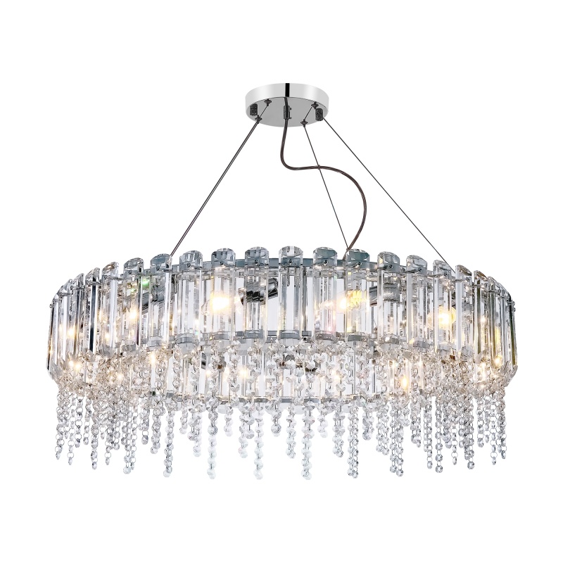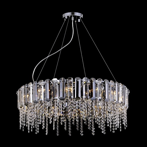 Арматура из металла, цвет – хром. Прозрачный хрустальный декор двух видов: крупный вытянутый по внешнему периметру и округлый на подвесках. Высота подвесных моделей регулируется. Цоколь Е14.