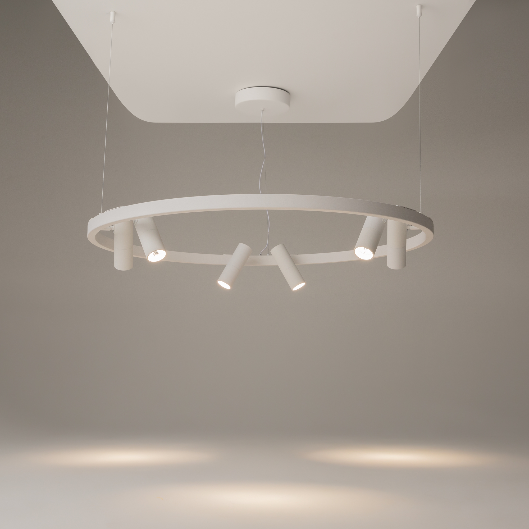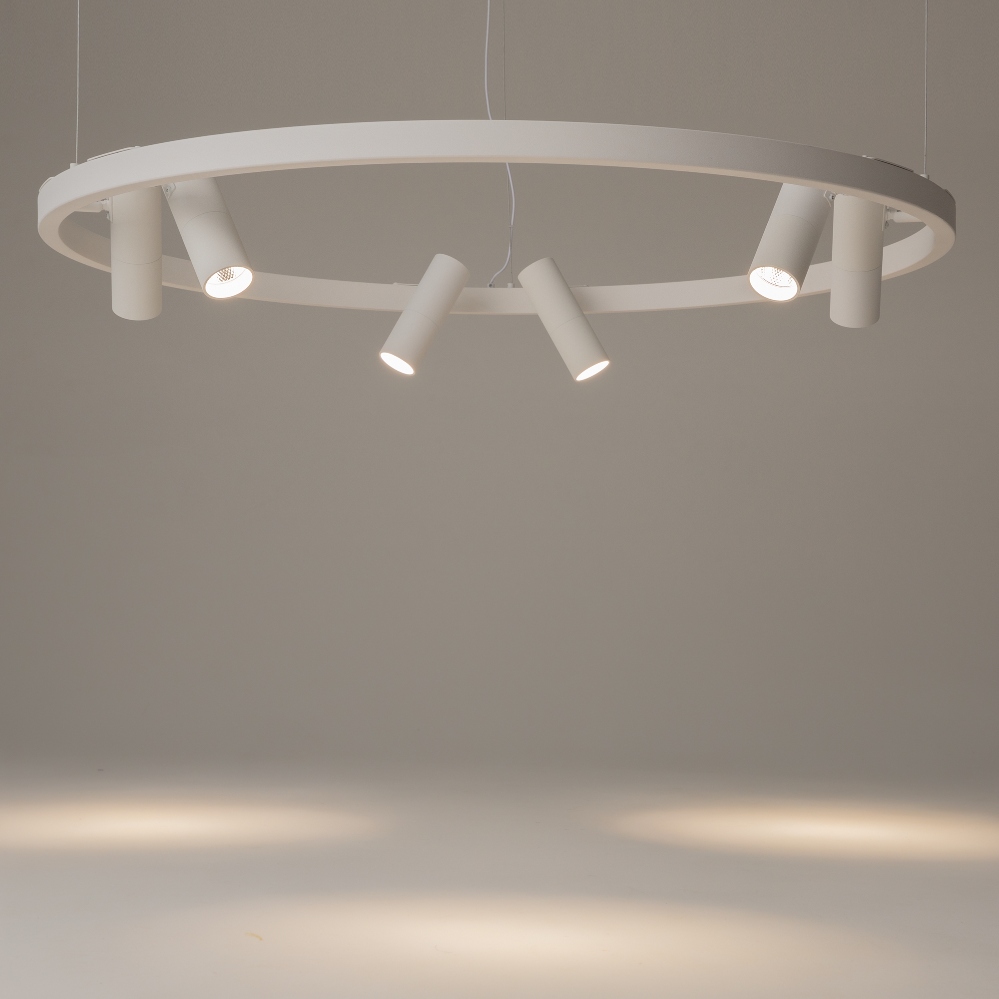 Металлическая арматура, оттенки – черный, белый. Плафоны-споты перемеща ются по кольцу, вращаются на 340° по горизонтали и 90° по вертикали. LED- модуль, акриловый рассеиватель.