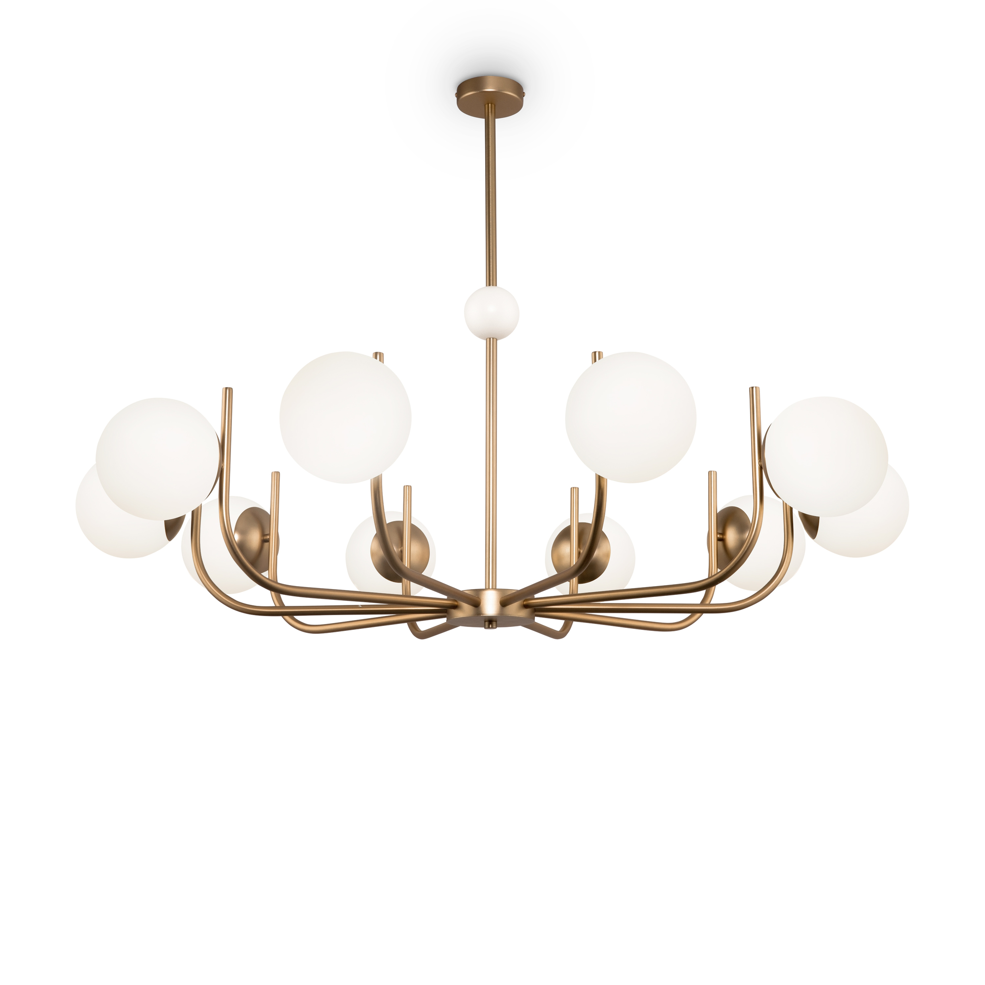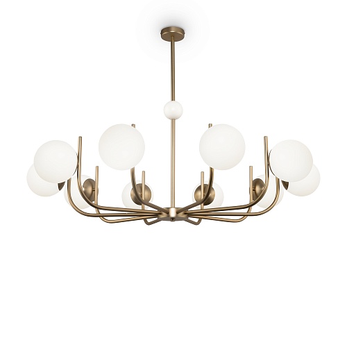 Арматура из металла окрашена в цвет латуни. Плафоны-сферы из матового белого стекла. Трендовые обтекаемые формы. Дизайн в стиле ретро. Источник света — лампы с цоколем Е14.