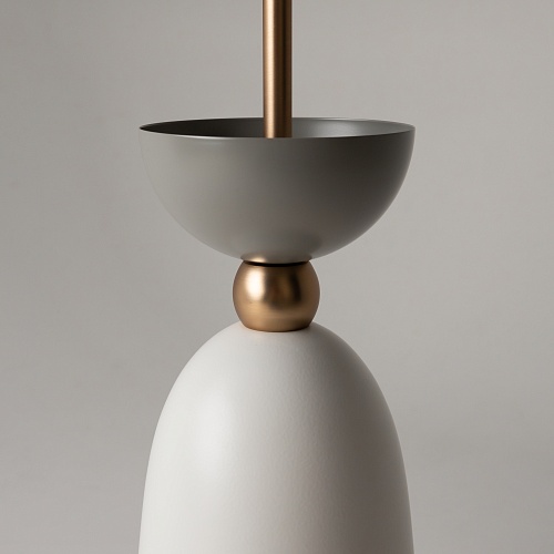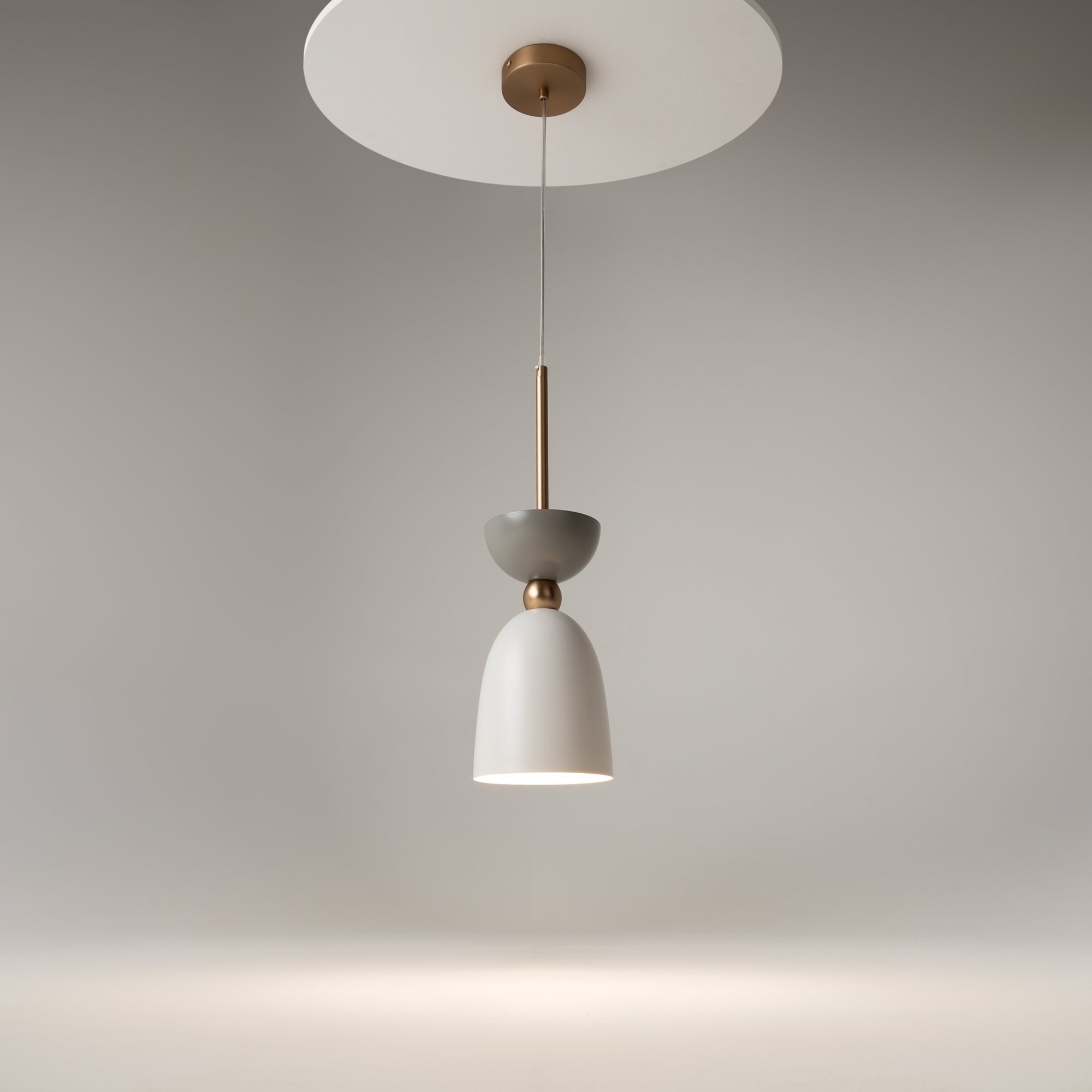 Арматура из металла, оттенки – латунь, белый. Металлические плафоны в двух цветовых решениях: белый + серый, голубой + бирюзовый. Оригинальная форма колокольчика. Поворотный механизм в плафонах для направленной подсветки.