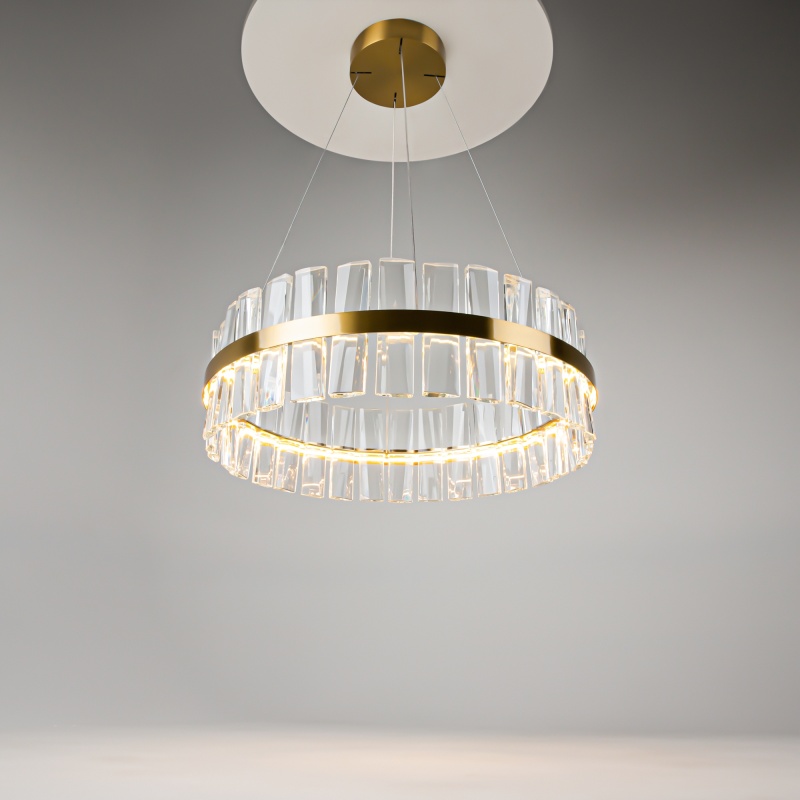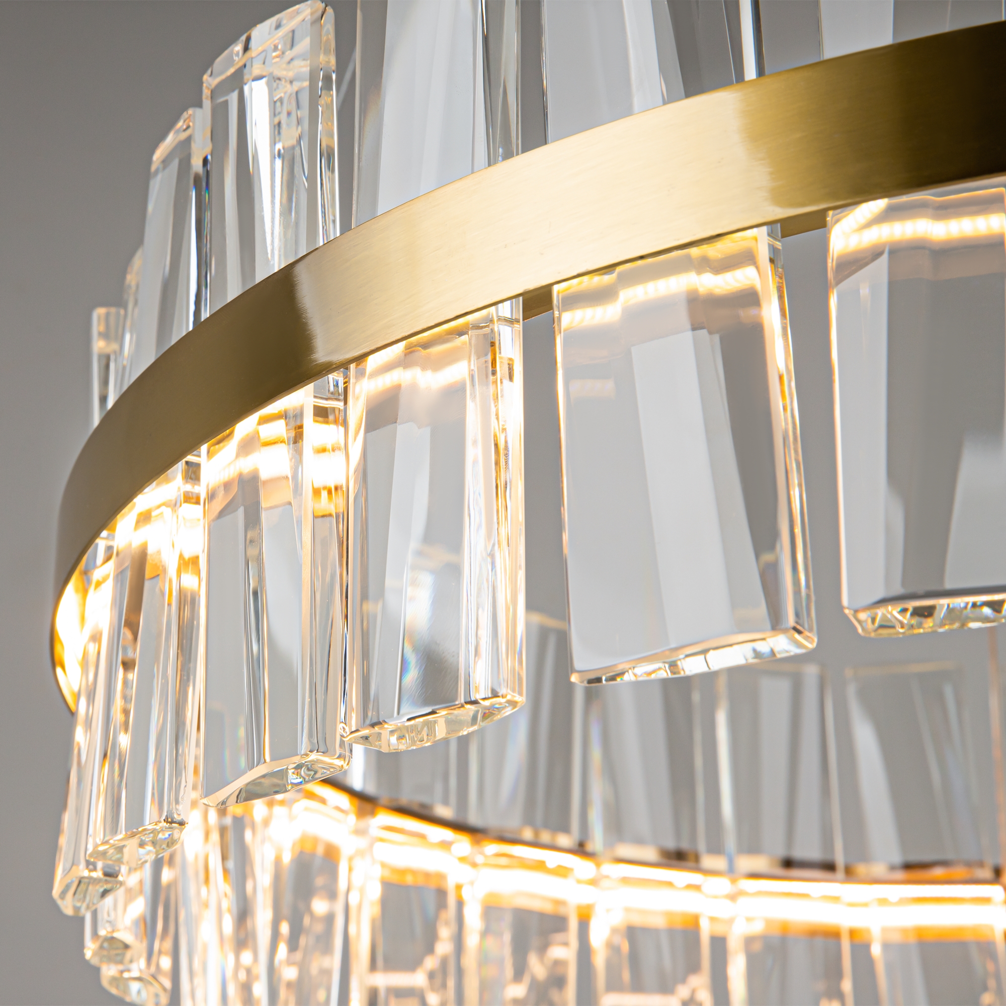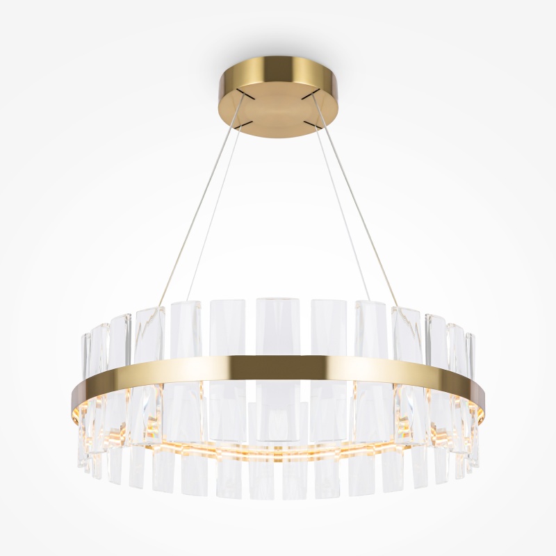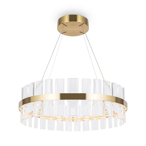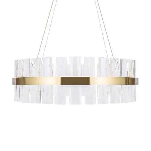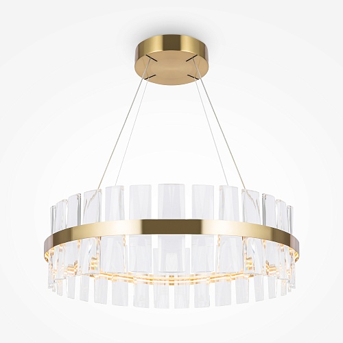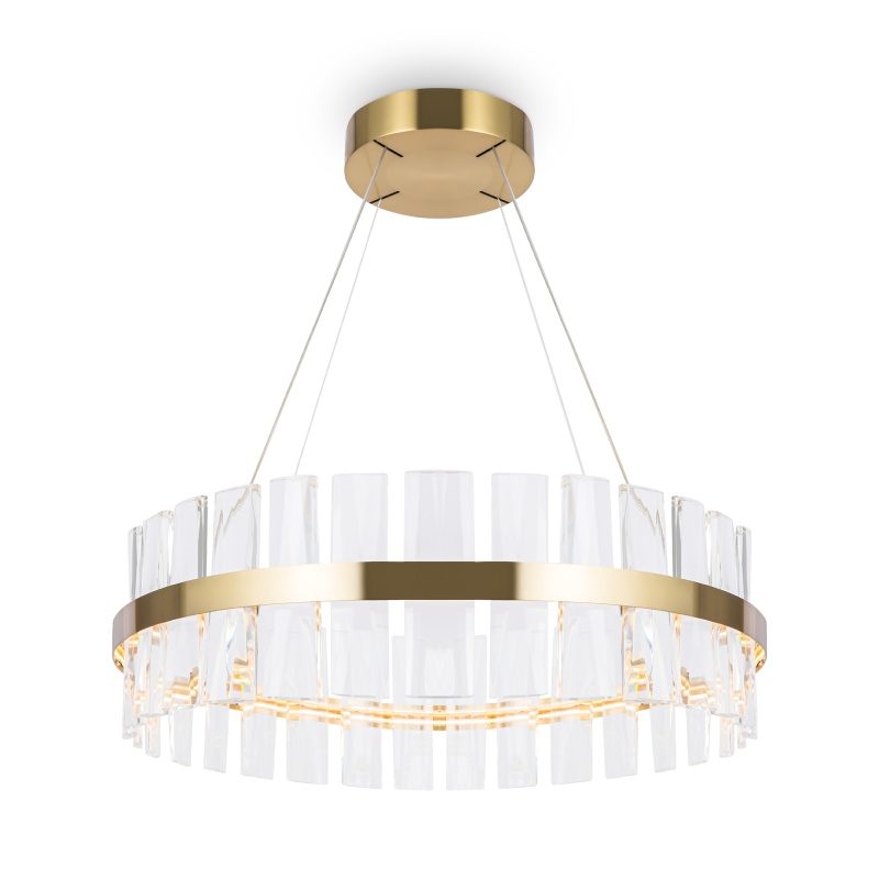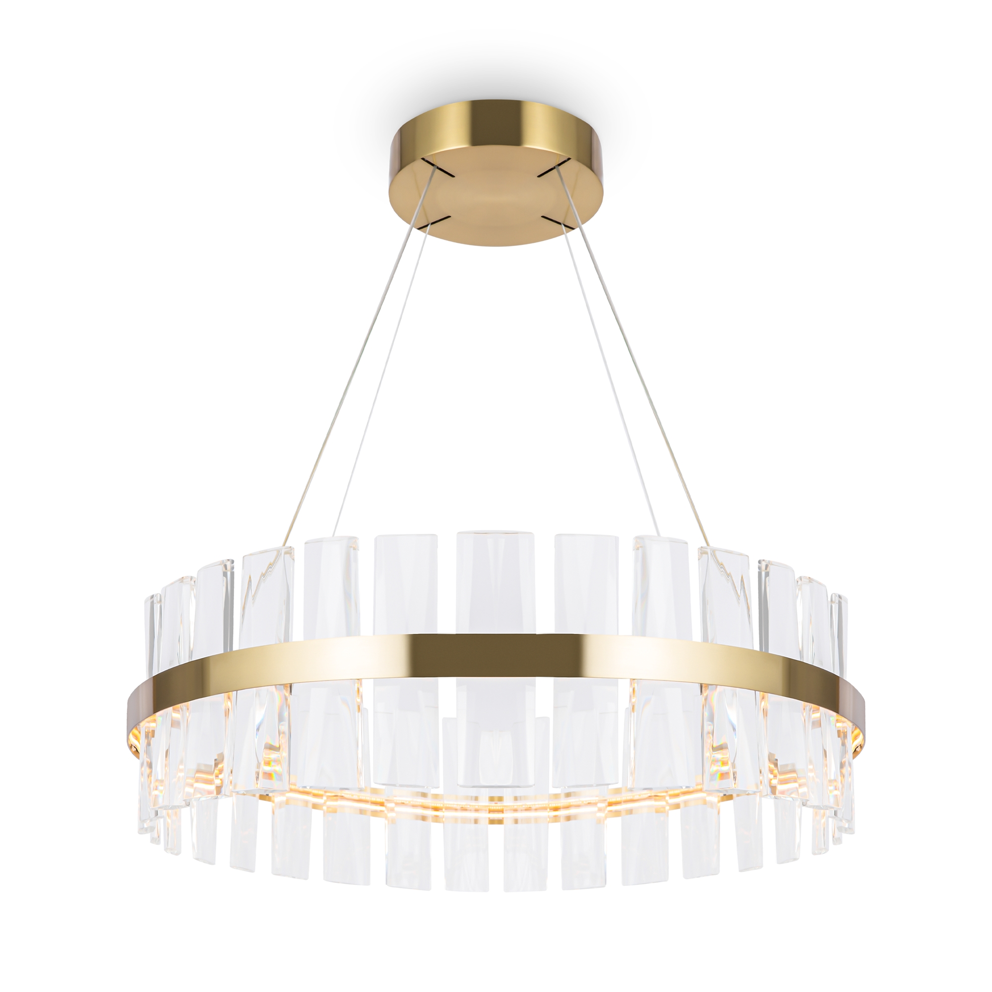 Материал арматуры - металл, цвет - латунь. Декор - объемные прозрачные хрустальные элементы с чередующимся рисунком. LED источник света, цветовая температура - 3000К. Регулируемая длина тросов.