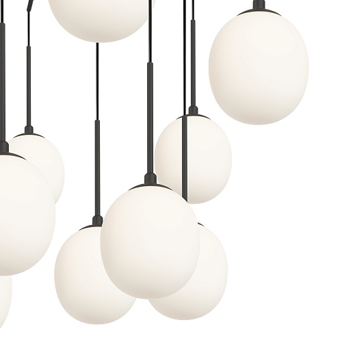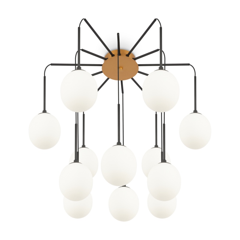 Металлическое основание, цвет - золото. Черная матовая арматура. Регулируемая высота плафонов за счет изменения длины проводов. Овальные плафоны из белого матового стекла с резьбой для удобной самостоятельной замены ламп. Цоколь G9. Лампы в комплект не входят.