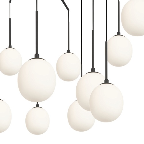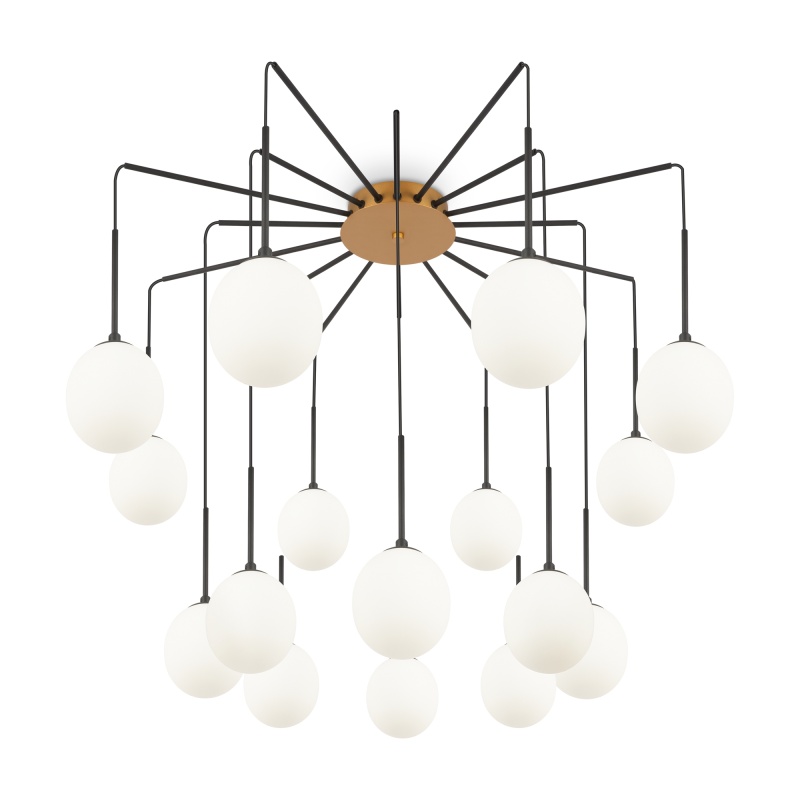 Металлическое основание, цвет - золото. Черная матовая арматура. Регулируемая высота плафонов за счет изменения длины проводов. Овальные плафоны из белого матового стекла с резьбой для удобной самостоятельной замены ламп. Цоколь G9. Лампы в комплект не входят.