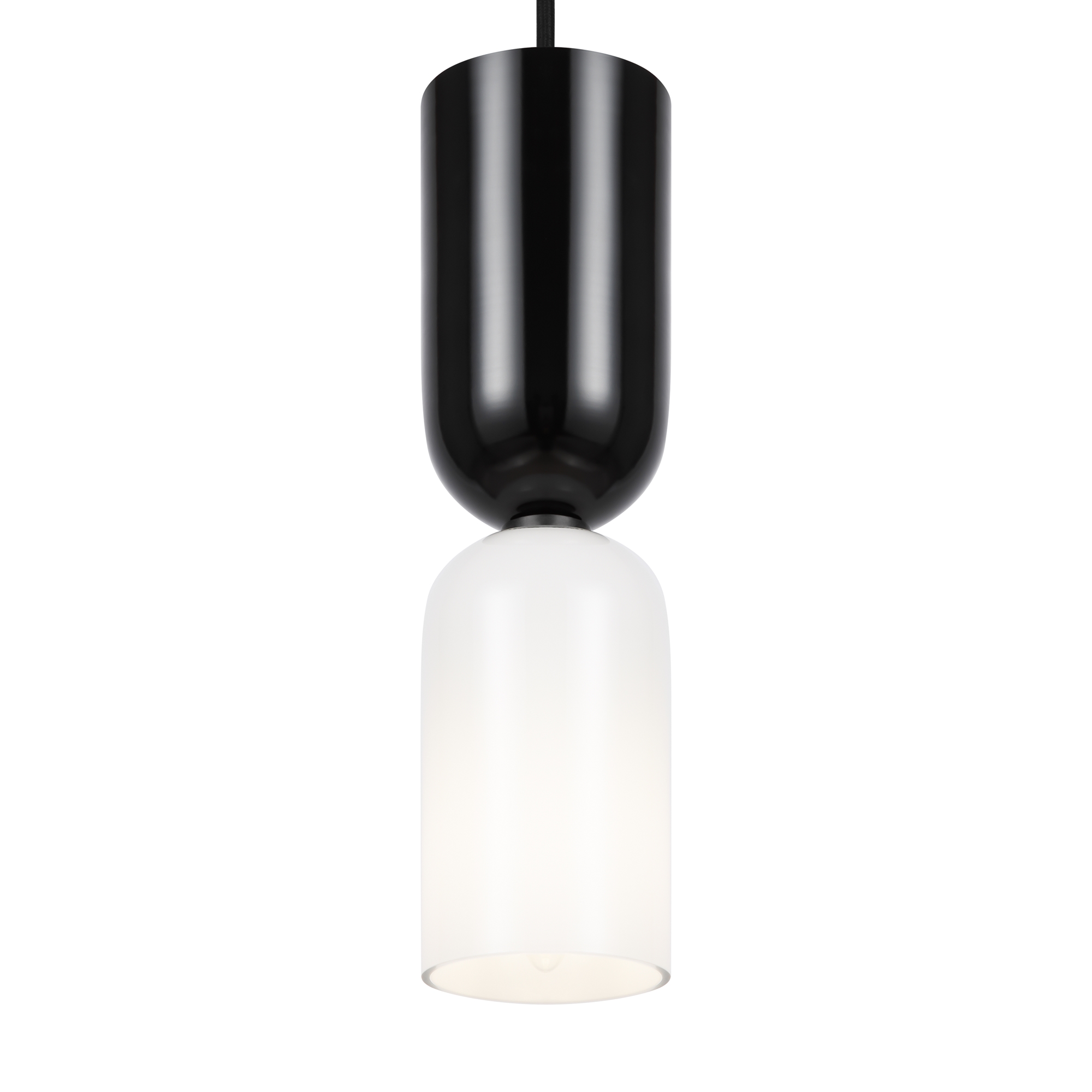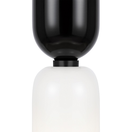 Металлическая арматура, цвет - черный. Светильники стилизованы под форму песочных часов с обтекаемой формой. Керамические элементы с глянцеовй глазурью. Подвесные светильники с плафонами из белой керамики с прозрачным, черно-белым, золото-белым и белым стеклом. Регулируемая высота подвесных светильников.