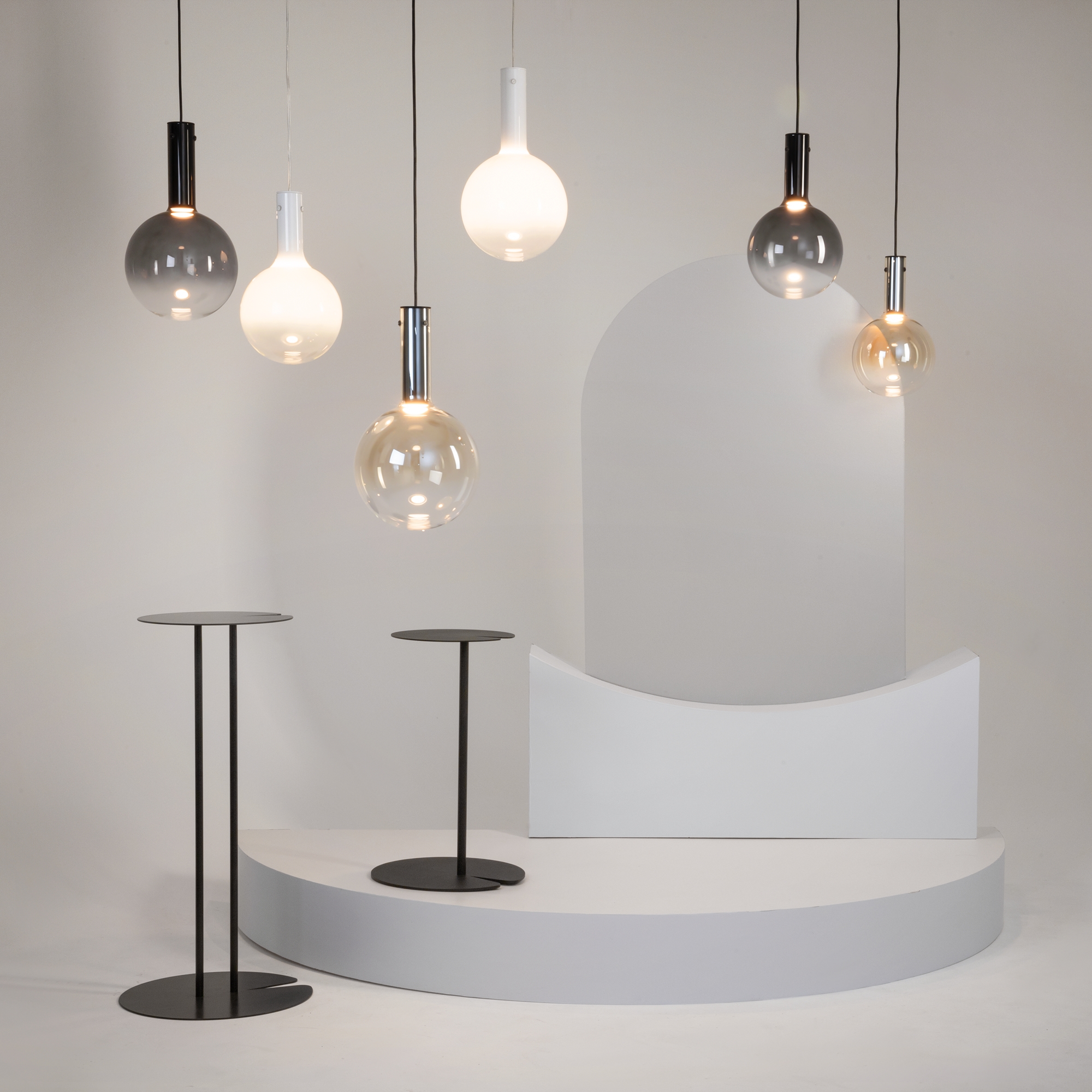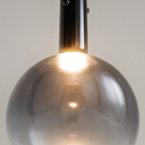 Металлическая арматура, цвет - черный, белый. Выдувной плафон-шар из стекла с вытянутым цилиндрическим основанием в трех цветах: дымчато-черный, туманно-белый, бежево-коньячный. LED-источник света в основании плафона. Цветовая температура 3000К. Два диаметра плафонов и регулируемая длина проводов для создания разнообразных композиций.