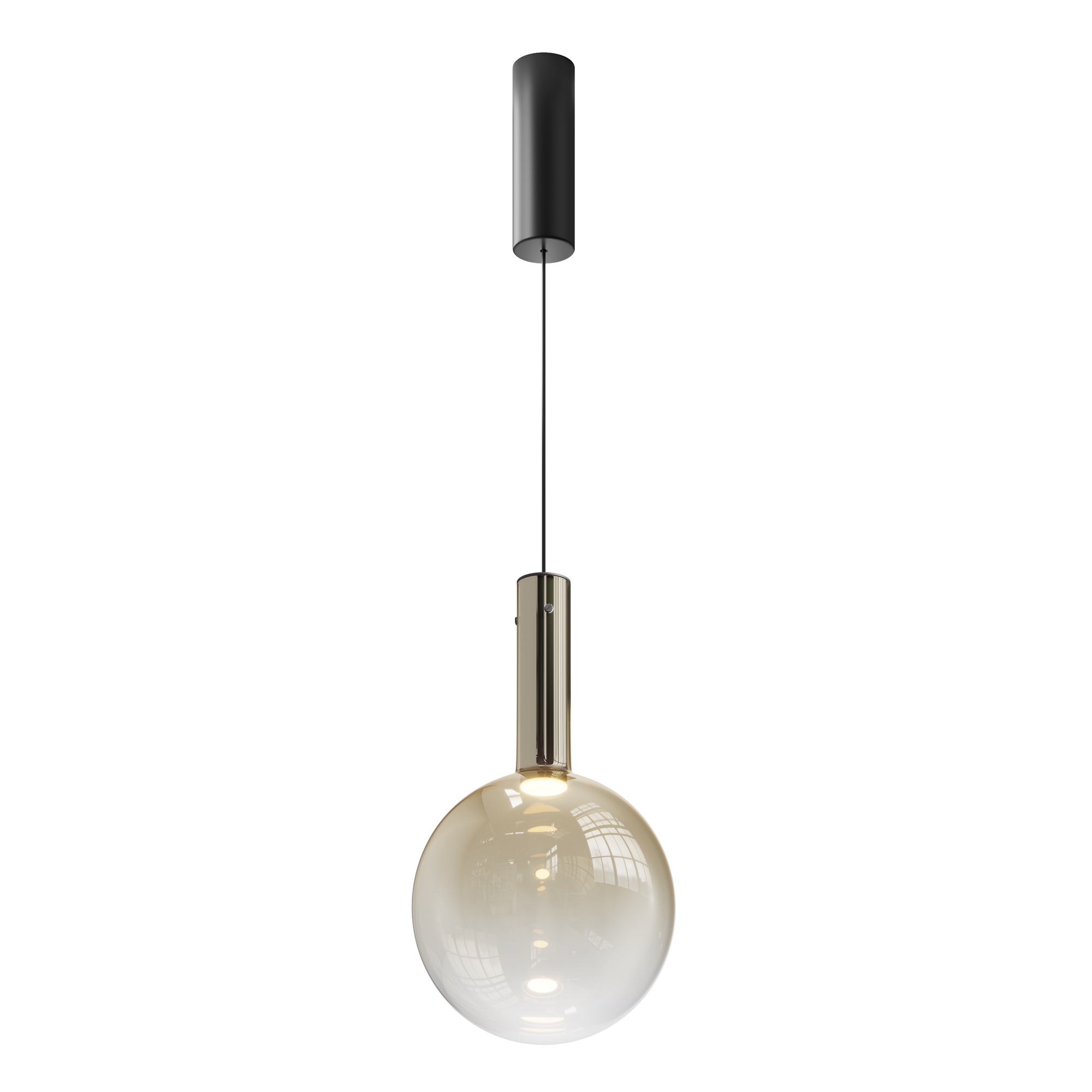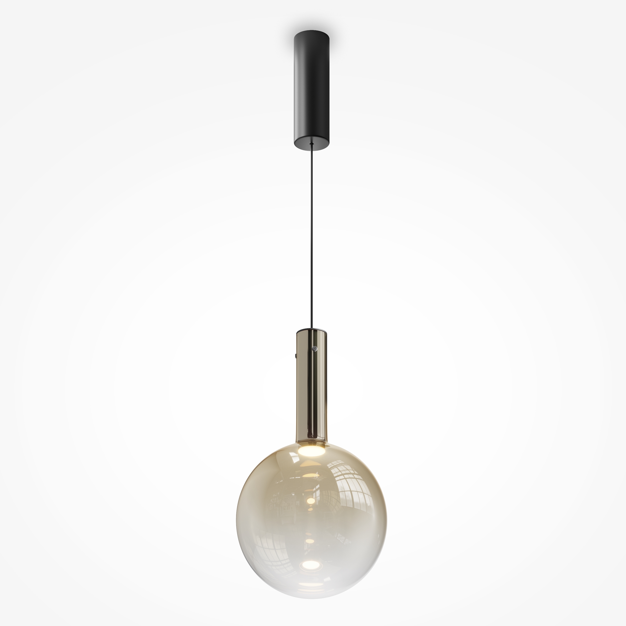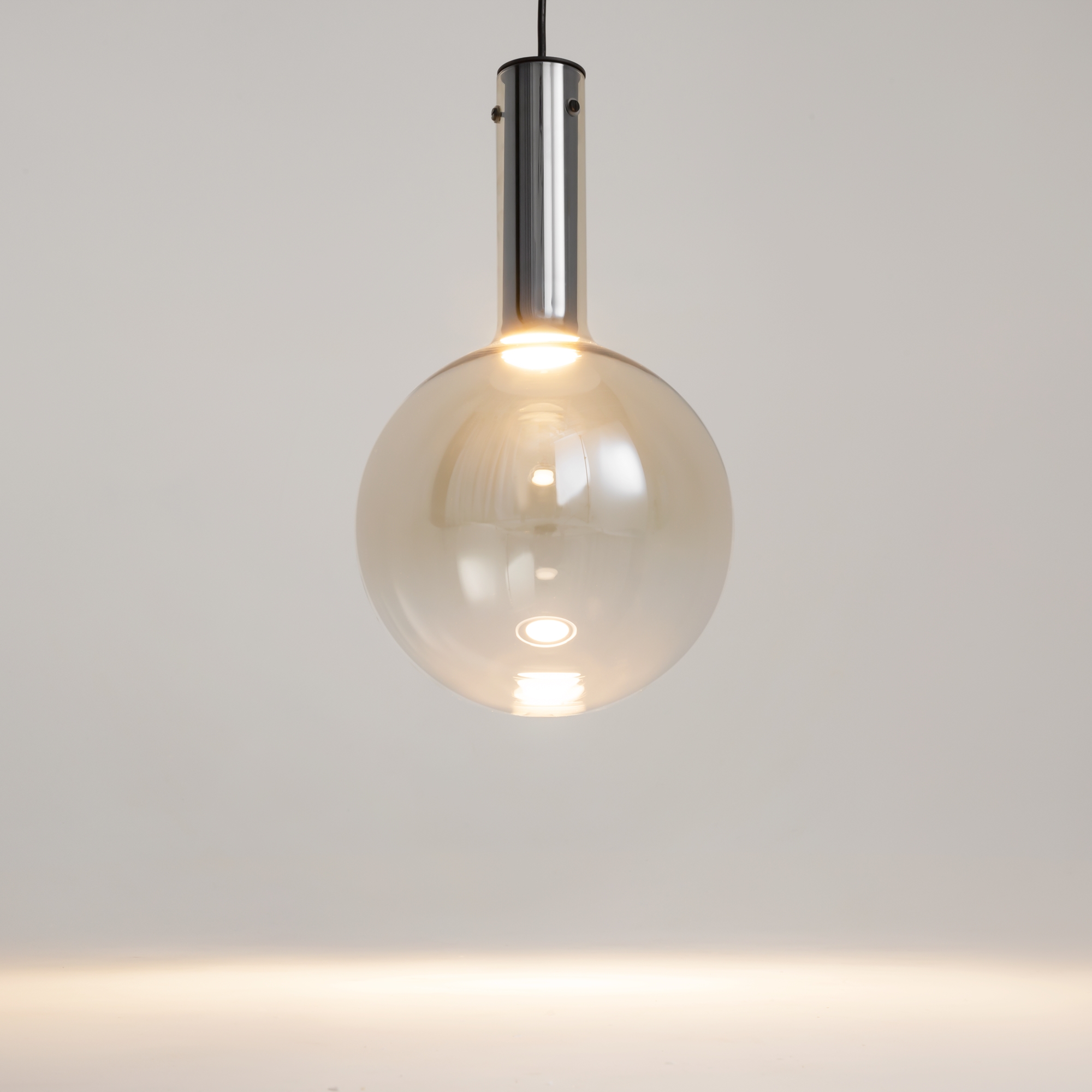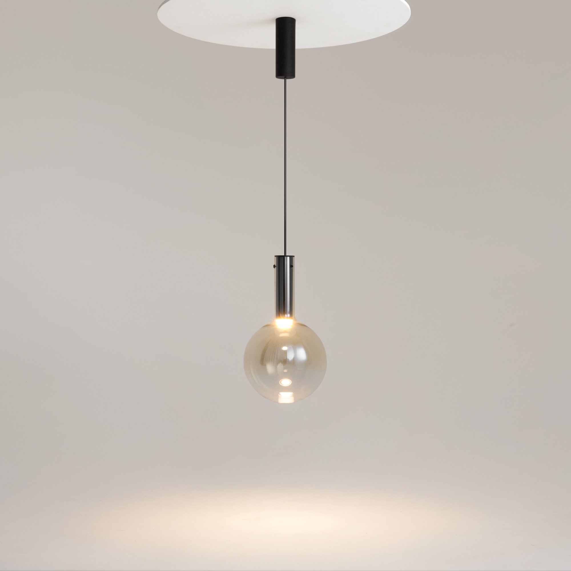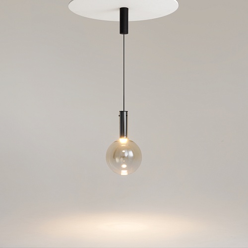 Металлическая арматура, цвет - черный, белый. Выдувной плафон-шар из стекла с вытянутым цилиндрическим основанием в трех цветах: дымчато-черный, туманно-белый, бежево-коньячный. LED-источник света в основании плафона. Цветовая температура 3000К. Два диаметра плафонов и регулируемая длина проводов для создания разнообразных композиций.