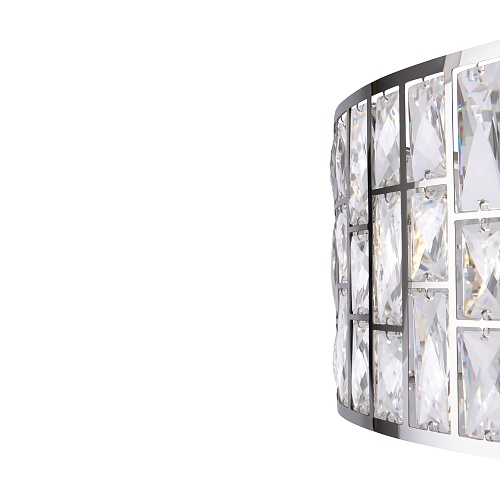 Металлическая арматура, цвет – хром. Каркас абажура – металл, декор – прозрач ный хрусталь. Потолочные модели с рассеивателем из матового стекла. Высота подвесных светильников регулируется.