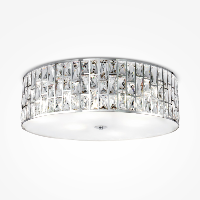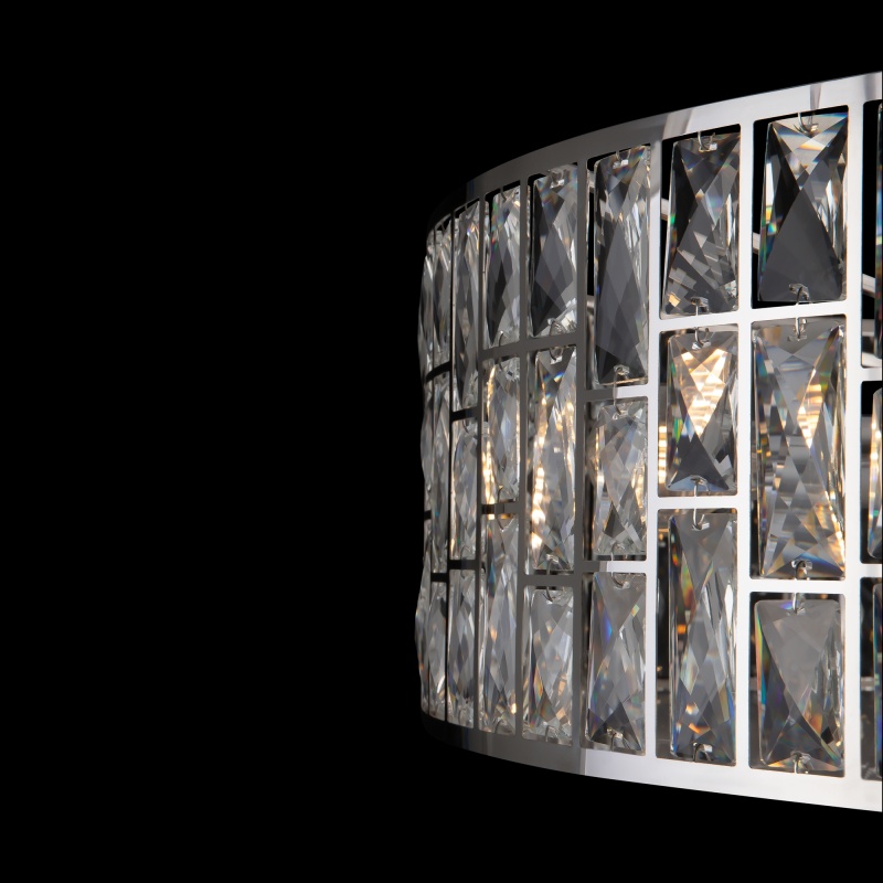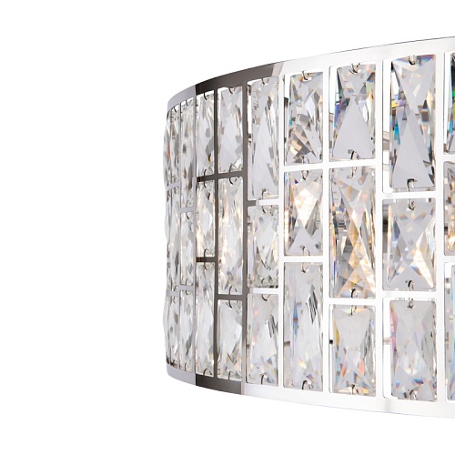 Металлическая арматура, цвет – хром. Каркас абажура – металл, декор – прозрач ный хрусталь. Потолочные модели с рассеивателем из матового стекла. Высота подвесных светильников регулируется.