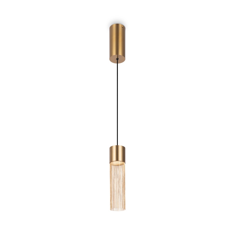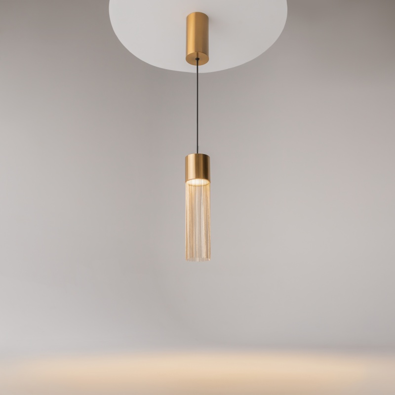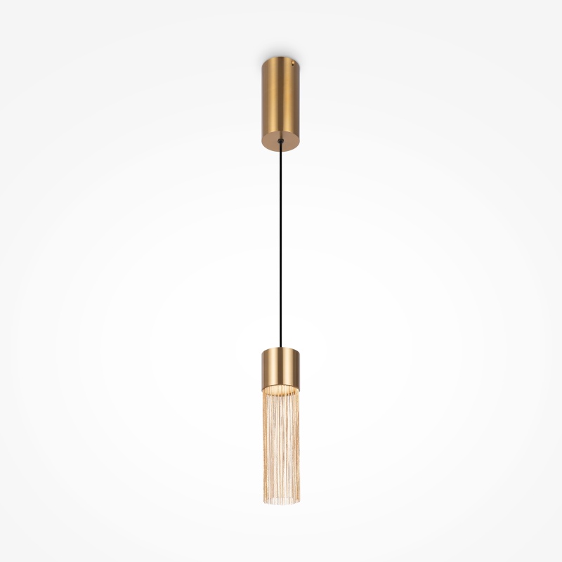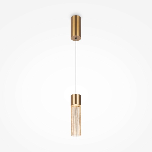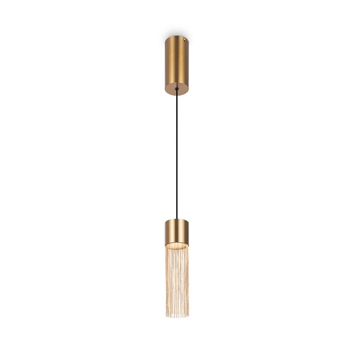 Металлическая арматура, цвет - золото. Мотивы ювелирного искусства в дизайне. Изящные цепочки на корпусе светильника создают переливы бликов. LED источник света. Цветовая температура - 3000К. Регулируемая высота подвесного светильника.