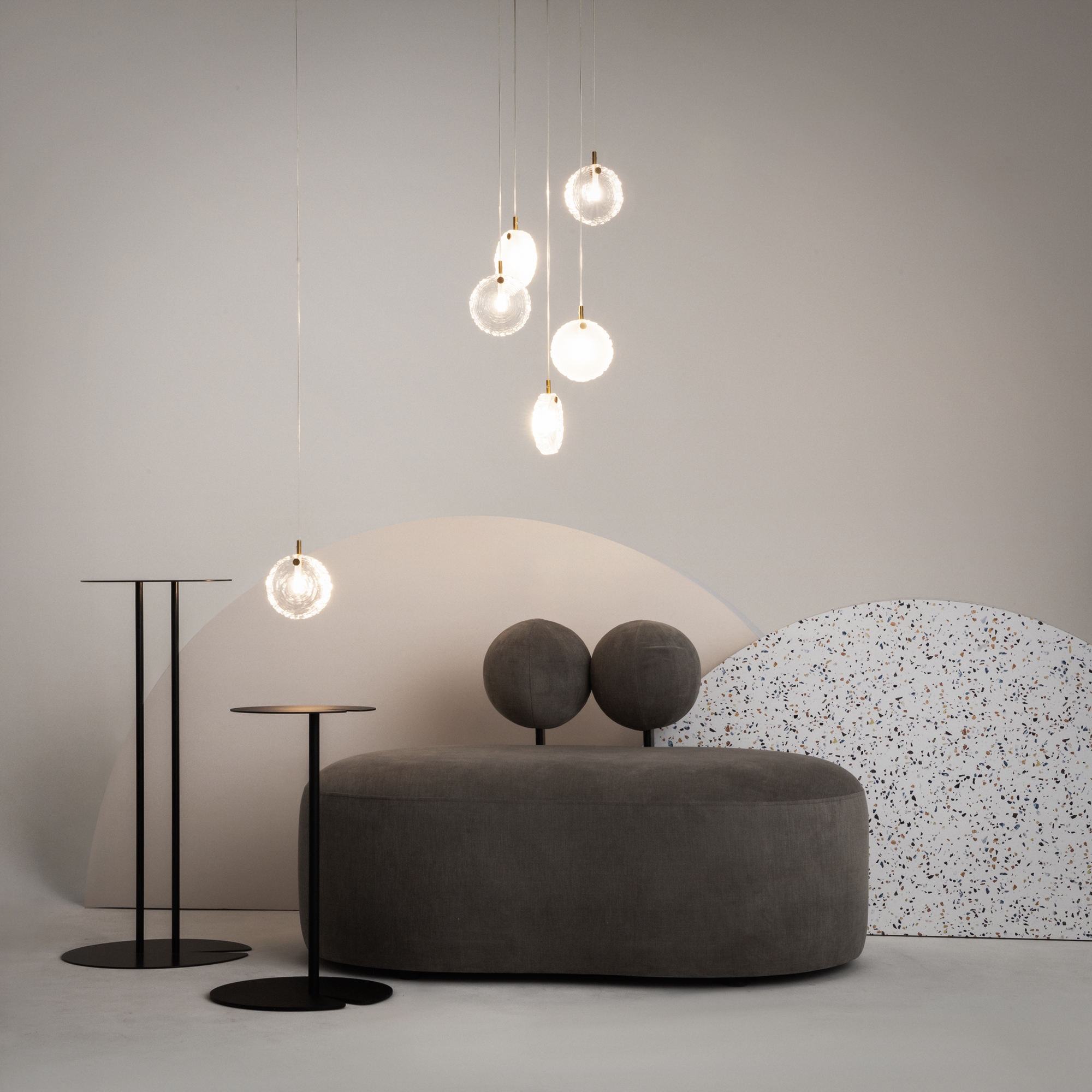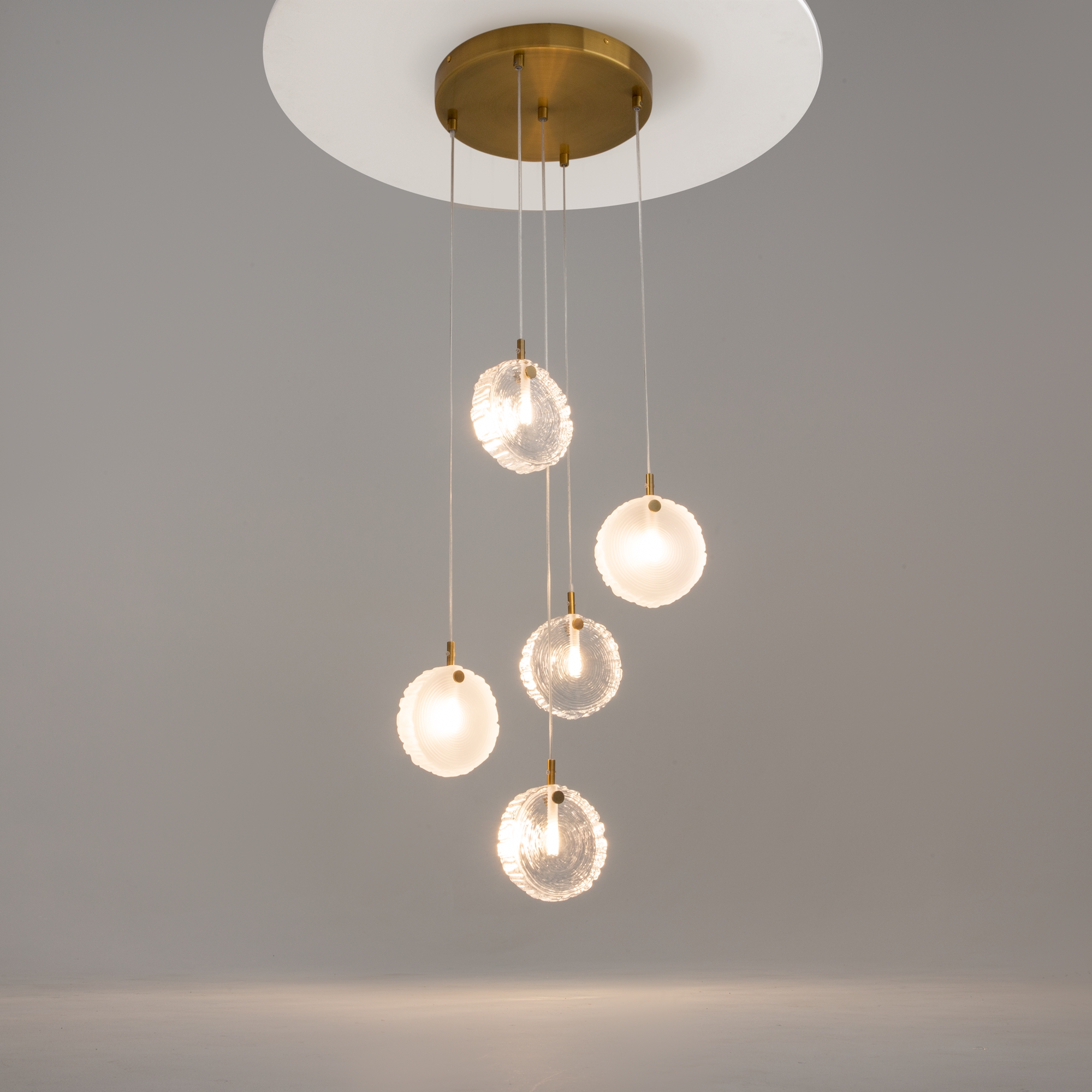 Материал арматуры - металл, цвет - латунь. Серия вдохновлена эстетикой северных лесов. Плафоны - литое цельное стекло в форме и фактуре среза дерева. Три варианта цвета плафонов: прозрачный; прозрачный + матовый; прозрачный + матовый + изумрудный. Эстетичные крепления и магнитная потолочная чаша без видимых болтов. Готовые композиции из 1, 5, 7 и 12 плафонов. Источник света - лампа с цоколем G4.
