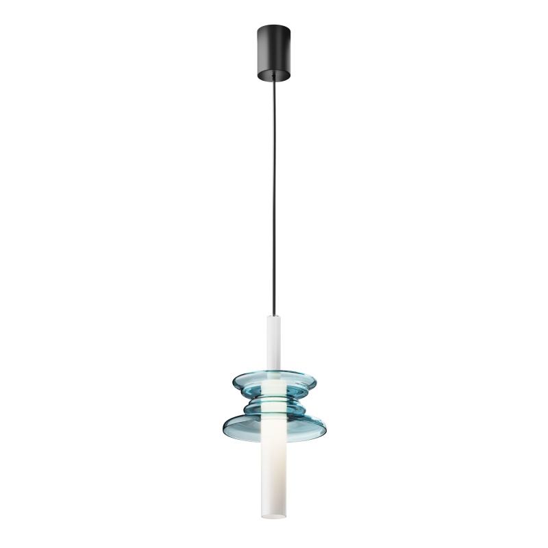 Уникальная многослойная конструкция в образе звуковой волны. Магнитная потололчная чаша из металла без видимых креплений. Плафон-трубка из белого полупрозрачного стекла. Декоративный волнообразный «звуковой» элемент из литого стекла в центре плафона. Цвета - синий, черный, золото, серый. Источник света - лампа с цоколем G9.