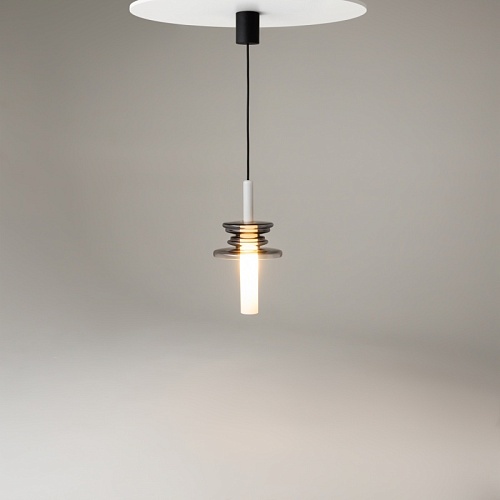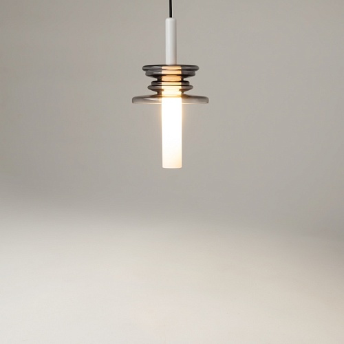 Уникальная многослойная конструкция в образе звуковой волны. Магнитная потололчная чаша из металла без видимых креплений. Плафон-трубка из белого полупрозрачного стекла. Декоративный волнообразный «звуковой» элемент из литого стекла в центре плафона. Цвета - синий, черный, золото, серый. Источник света - лампа с цоколем G9.