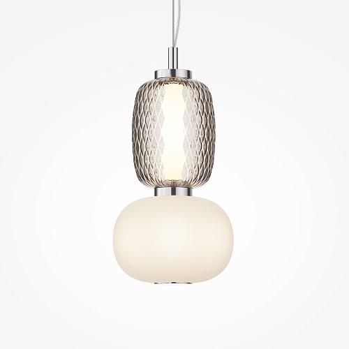 Металлическая арматура, цвет - золото, хром. Микс плафонов округлых и вытянутых форм из белого матового и прозрачного стекла с сетчатым и с линейным повторяющимся рельефным рисунком. Регулируемая высота подвесных моделей, провод - 3 метра. LED-источник света, цветовая температура 3000К.