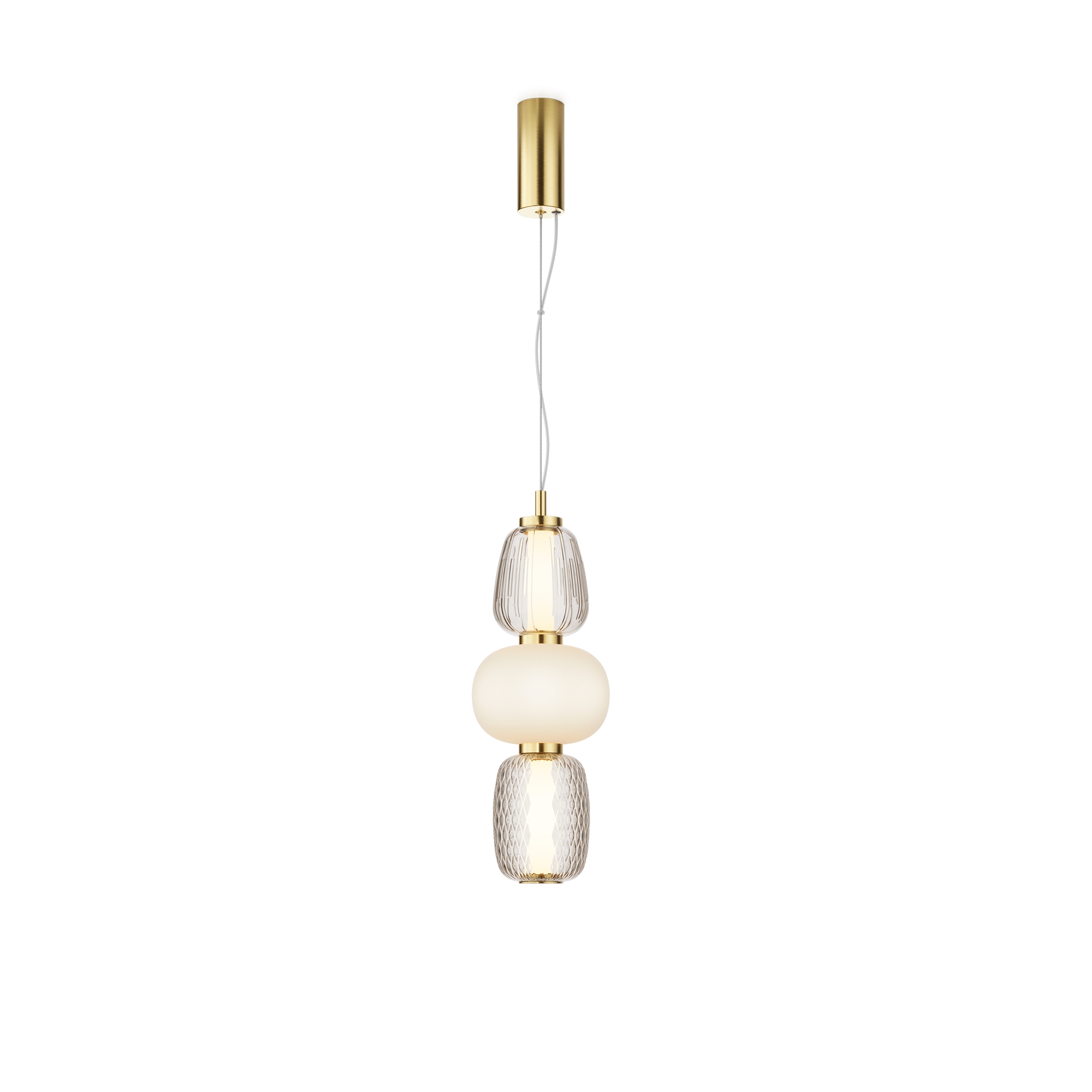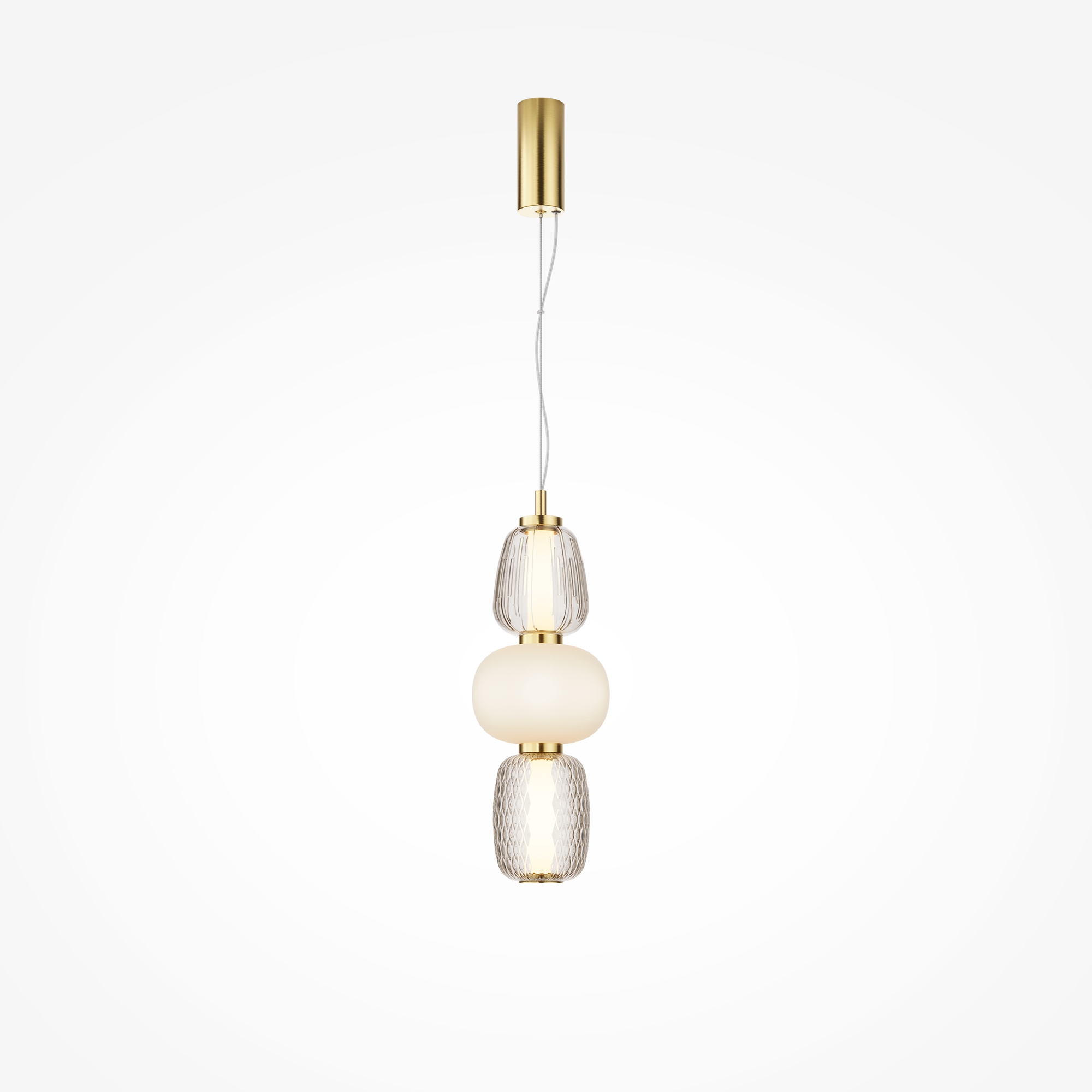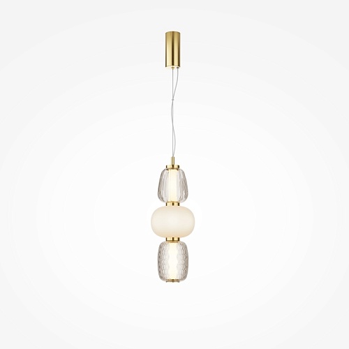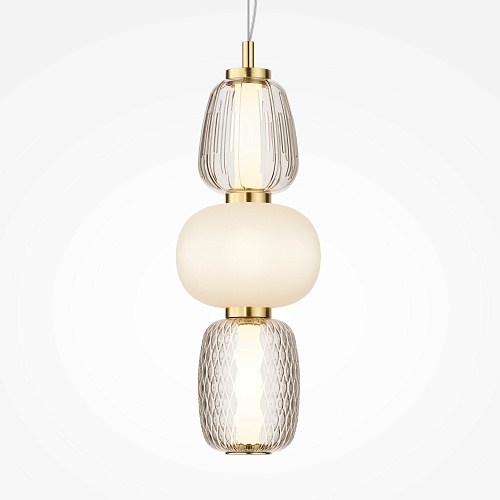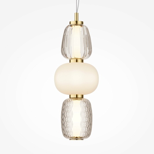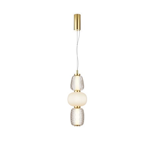 Металлическая арматура, цвет - золото, хром. Микс плафонов округлых и вытянутых форм из белого матового и прозрачного стекла с сетчатым и с линейным повторяющимся рельефным рисунком. Регулируемая высота подвесных моделей, провод - 3 метра. LED-источник света, цветовая температура 3000К.