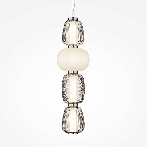 Металлическая арматура, цвет - золото, хром. Микс плафонов округлых и вытянутых форм из белого матового и прозрачного стекла с сетчатым и с линейным повторяющимся рельефным рисунком. Регулируемая высота подвесных моделей, провод - 3 метра. LED-источник света, цветовая температура 3000К.