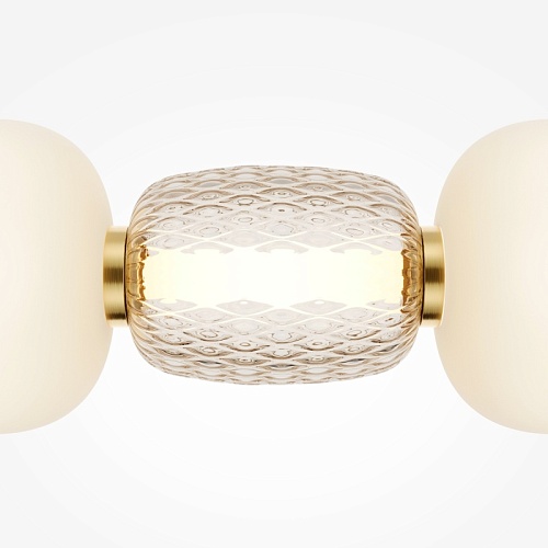 Металлическая арматура, цвет - золото, хром. Микс плафонов округлых и вытянутых форм из белого матового и прозрачного стекла с сетчатым и с линейным повторяющимся рельефным рисунком. Регулируемая высота подвесных моделей, провод - 3 метра. LED-источник света, цветовая температура 3000К.