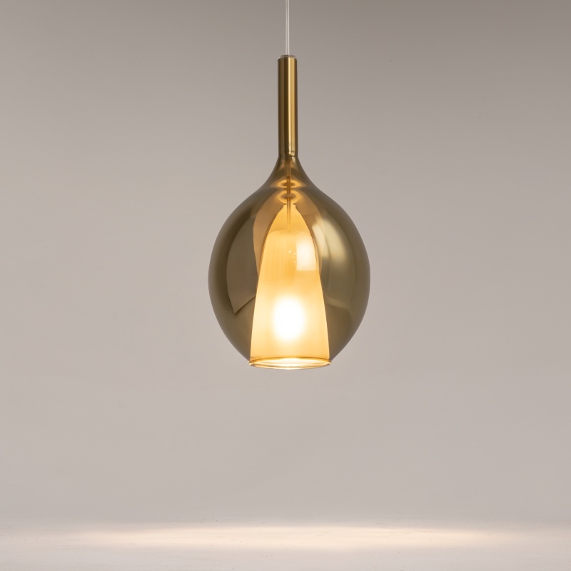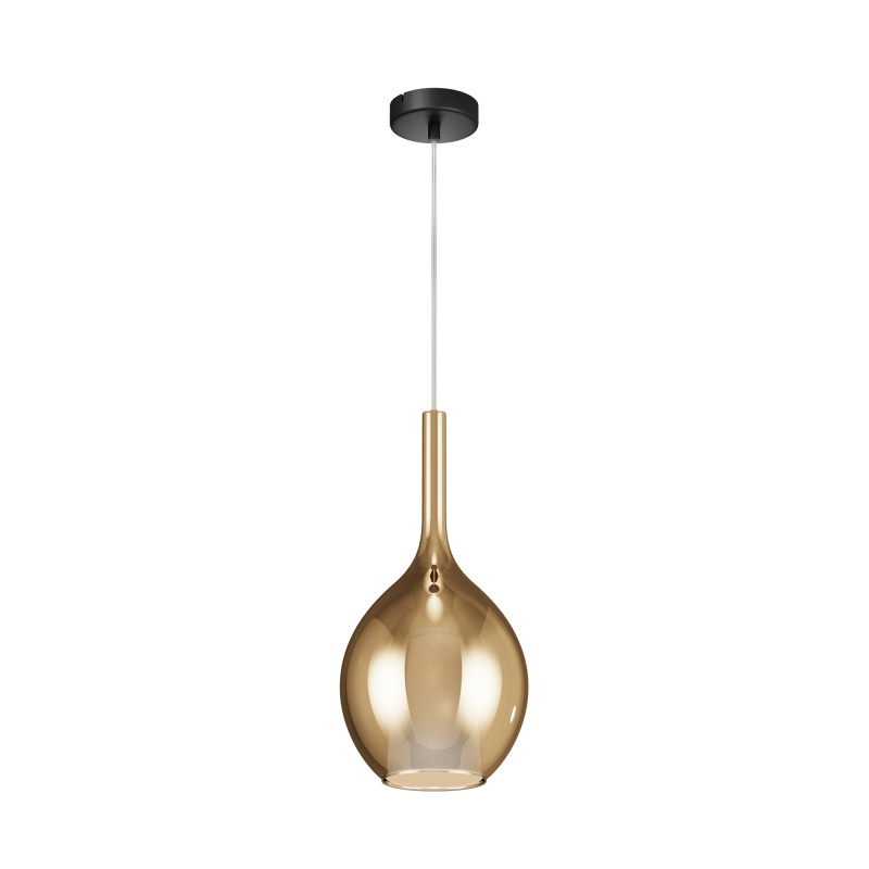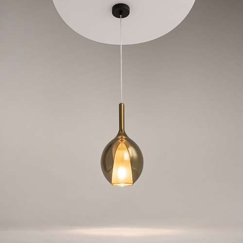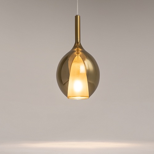 Металлическое основание, цвет - черный. Плафоны из двойного стекла. Внутренний прозрачный в форме конуса. Внешний плафон в трех геометрических формах, цвет стекла: зеркальные золотой, кофейный, дымчатый. Регулируемая длина провода - 3 метра. Источник света - лампа с цоколем Е27.