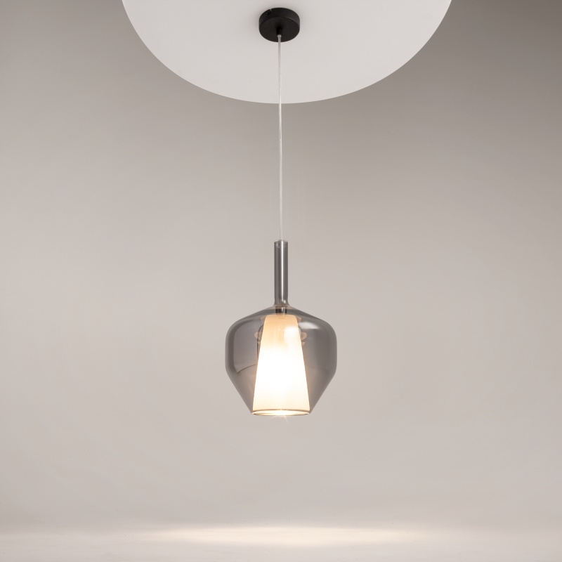 Металлическое основание, цвет - черный. Плафоны из двойного стекла. Внутренний прозрачный в форме конуса. Внешний плафон в трех геометрических формах, цвет стекла: зеркальные золотой, кофейный, дымчатый. Регулируемая длина провода - 3 метра. Источник света - лампа с цоколем Е27.