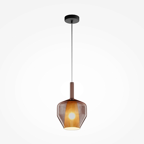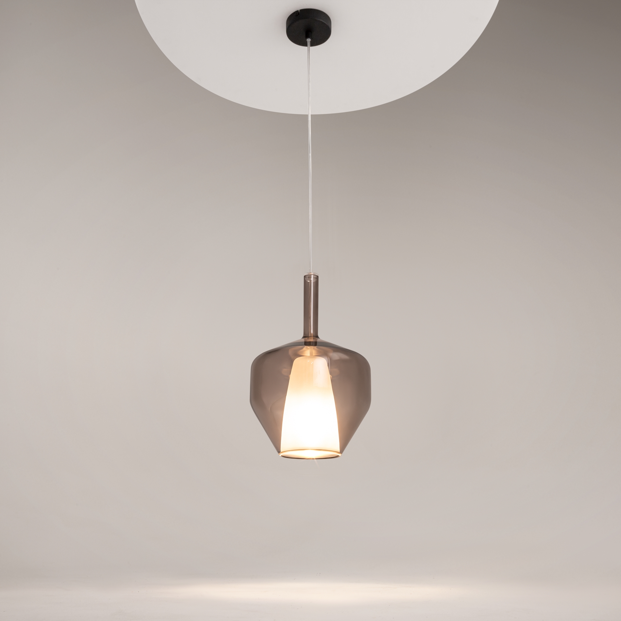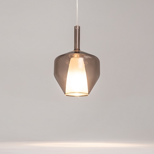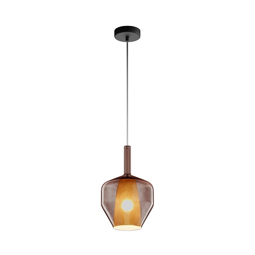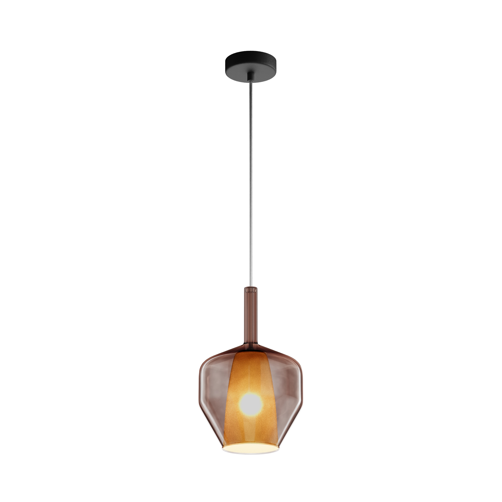 Металлическое основание, цвет - черный. Плафоны из двойного стекла. Внутренний прозрачный в форме конуса. Внешний плафон в трех геометрических формах, цвет стекла: зеркальные золотой, кофейный, дымчатый. Регулируемая длина провода - 3 метра. Источник света - лампа с цоколем Е27.