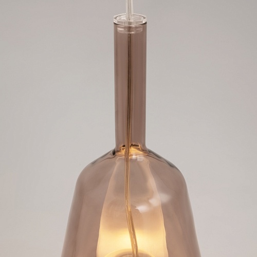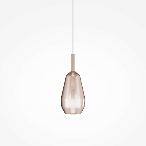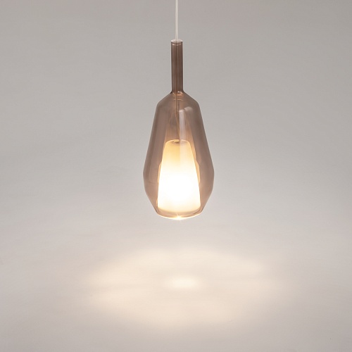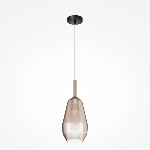 Металлическое основание, цвет - черный. Плафоны из двойного стекла. Внутренний прозрачный в форме конуса. Внешний плафон в трех геометрических формах, цвет стекла: зеркальные золотой, кофейный, дымчатый. Регулируемая длина провода - 3 метра. Источник света - лампа с цоколем Е27.