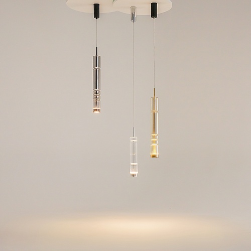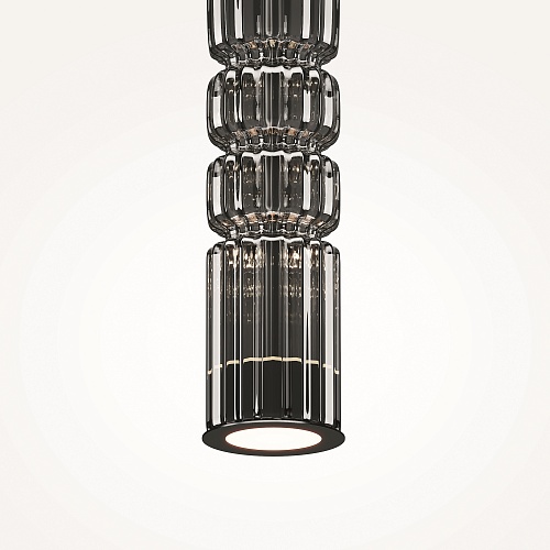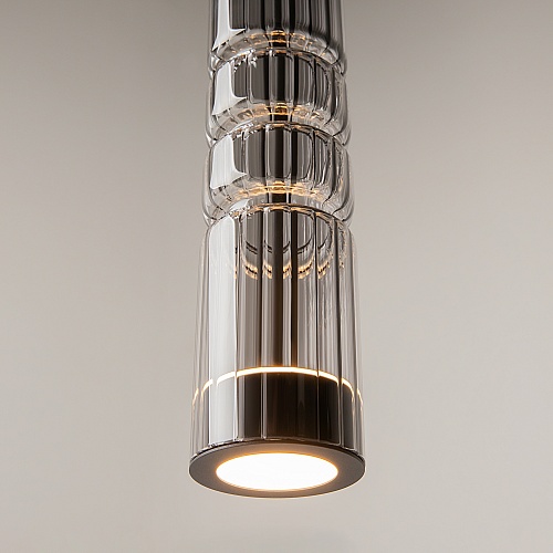 Арматура - металл, цвет - хром, черный. Цилиндрические плафоны из стекла с вертикальным рельефным рисунком в трех оттенках: прозрачный, коньячный, дымчатый. Метафора древнегреческих храмовых колонн в образе светильников. LED-источник света. Цветовая температура 3000К.