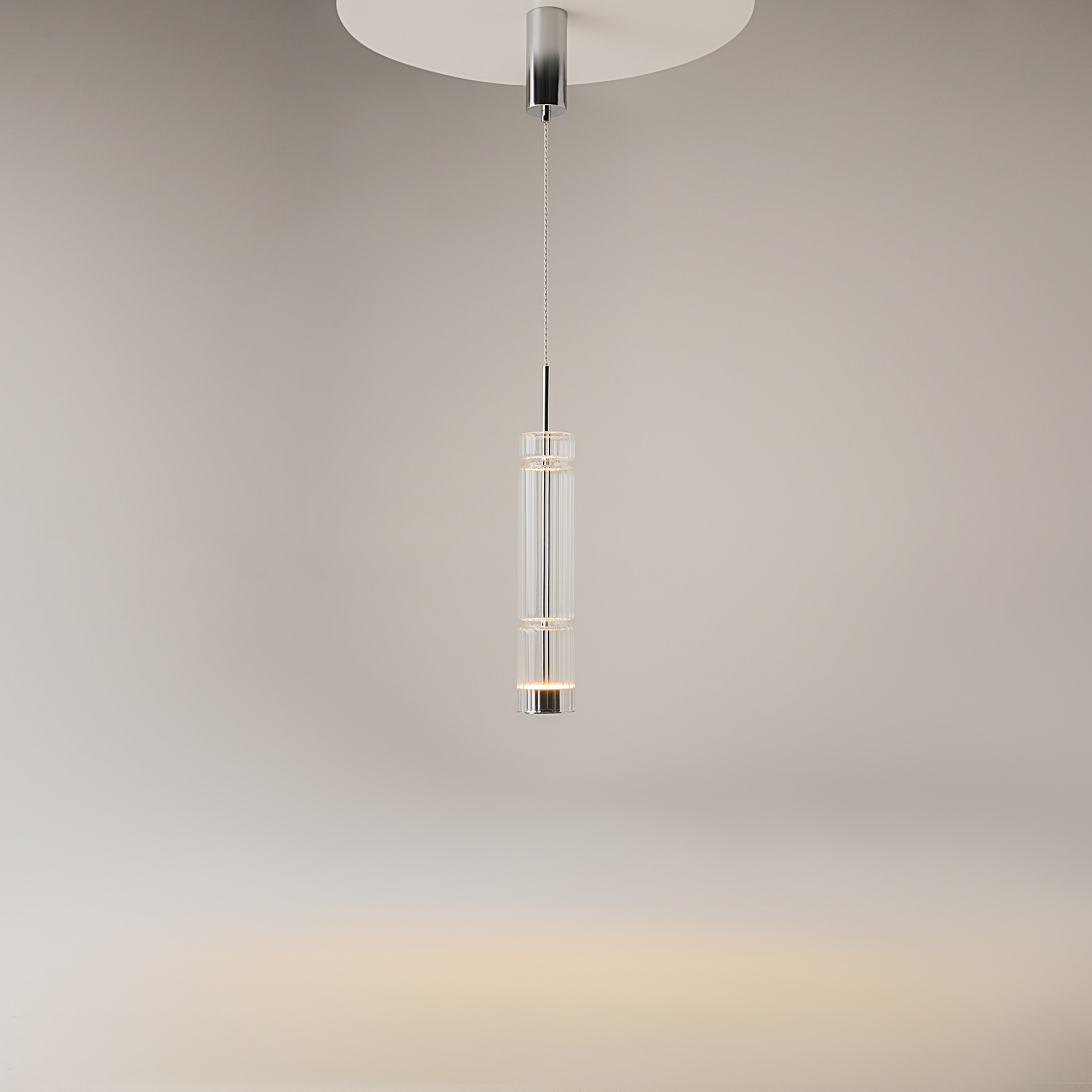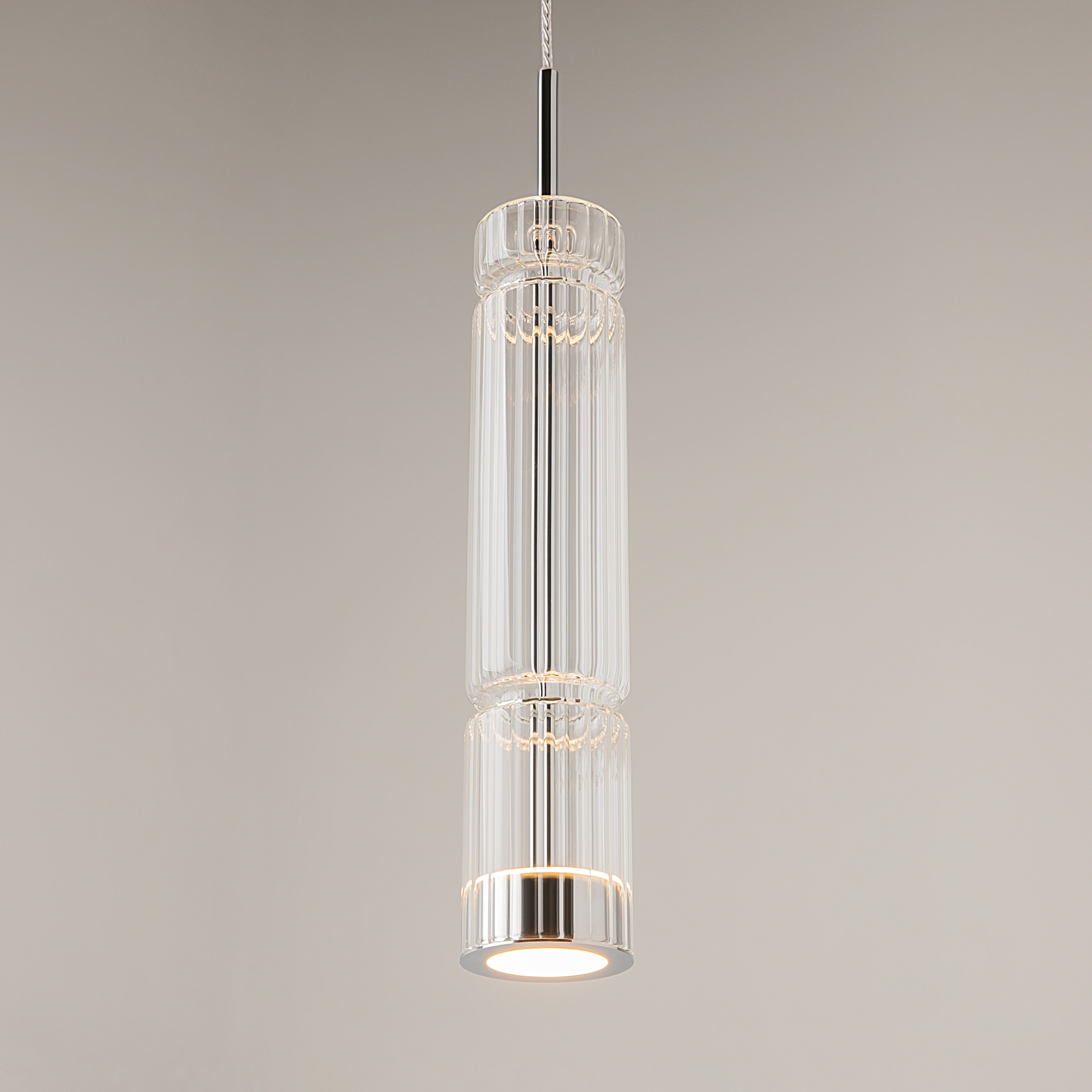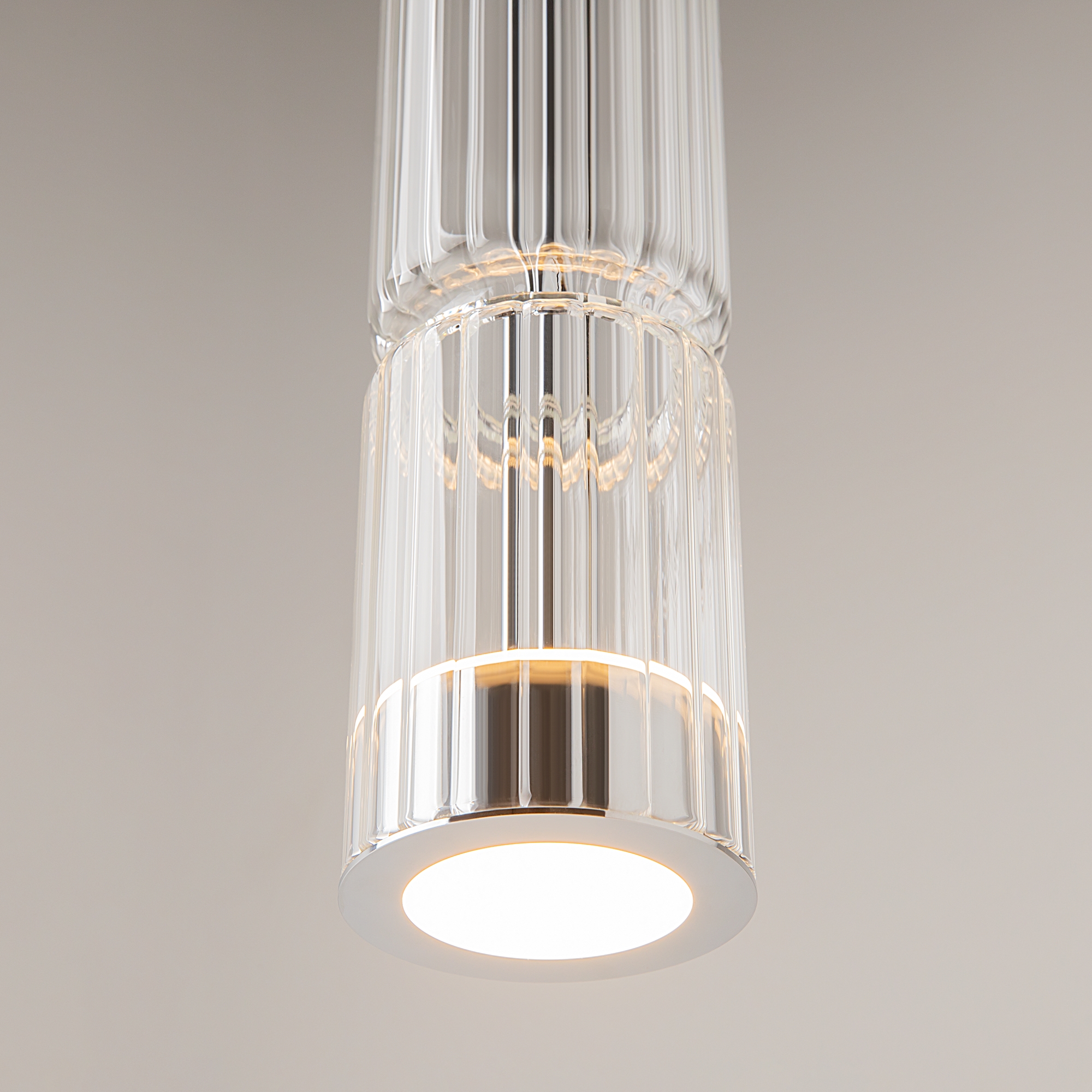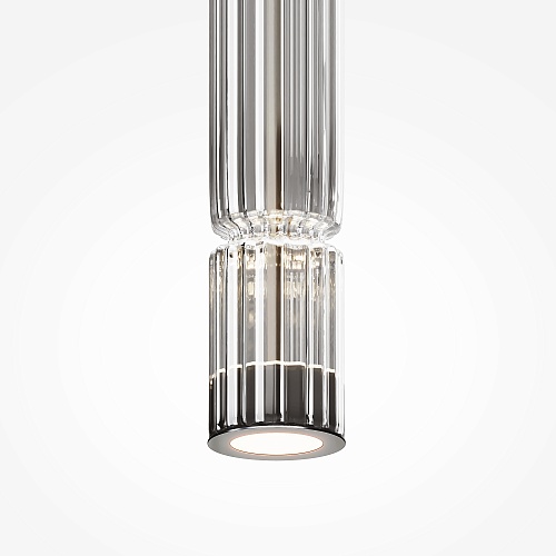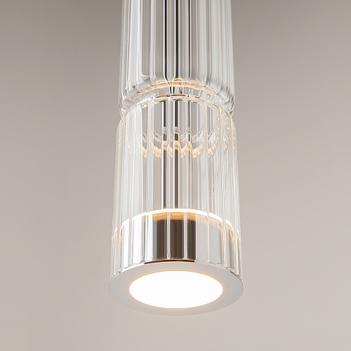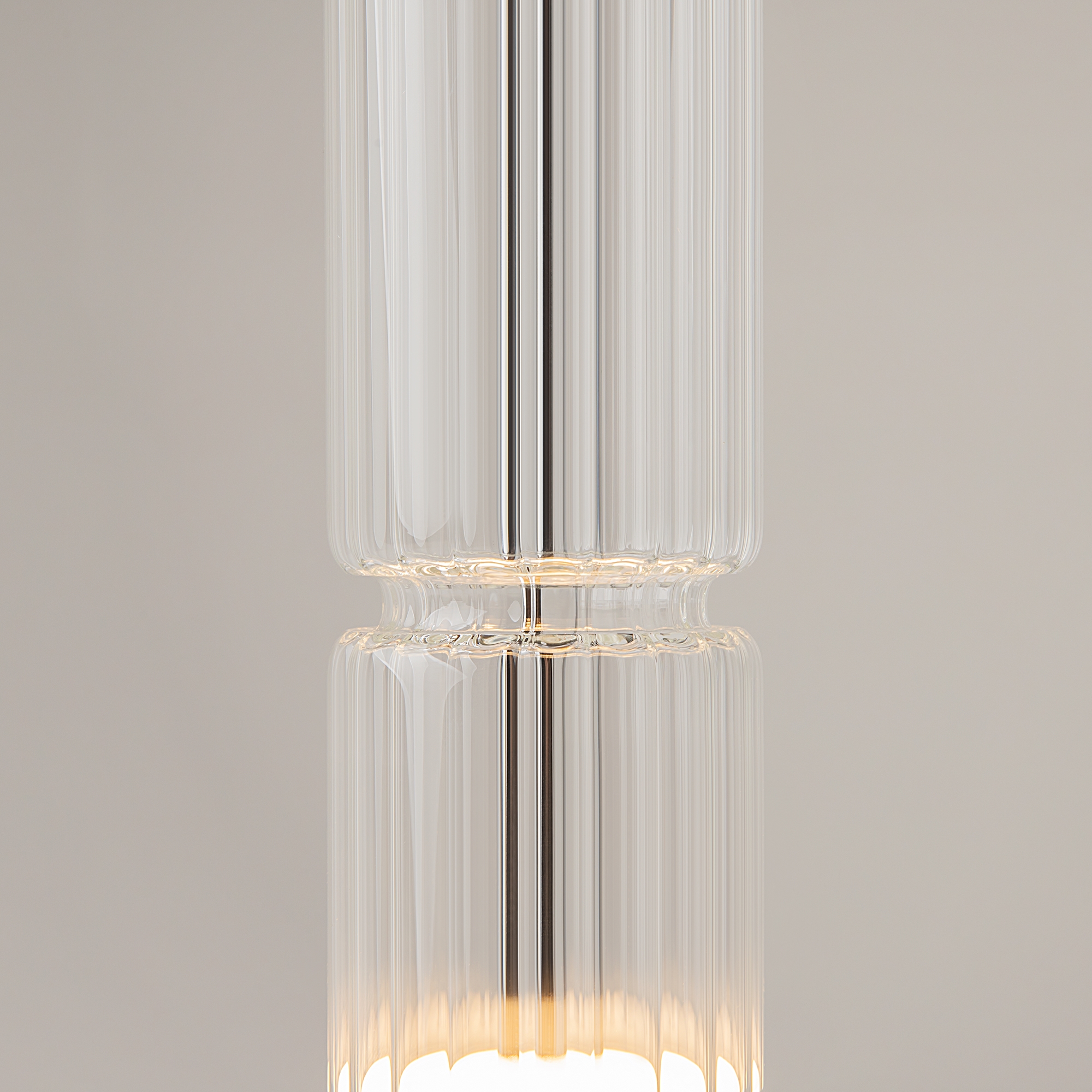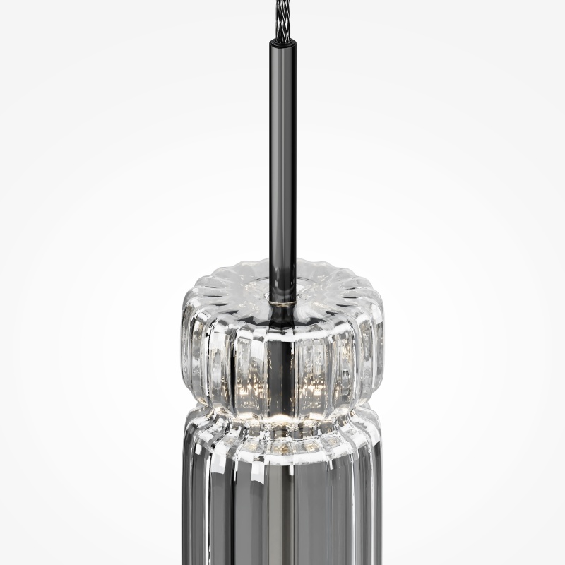 Арматура - металл, цвет - хром, черный. Цилиндрические плафоны из стекла с вертикальным рельефным рисунком в трех оттенках: прозрачный, коньячный, дымчатый. Метафора древнегреческих храмовых колонн в образе светильников. LED-источник света. Цветовая температура 3000К.
