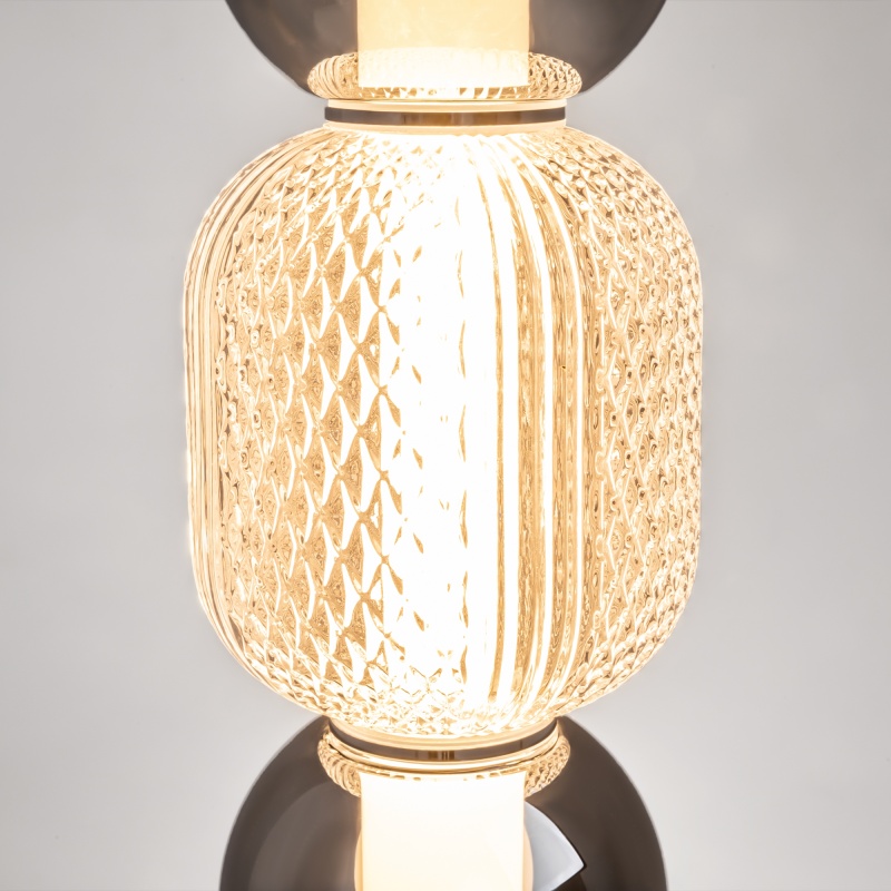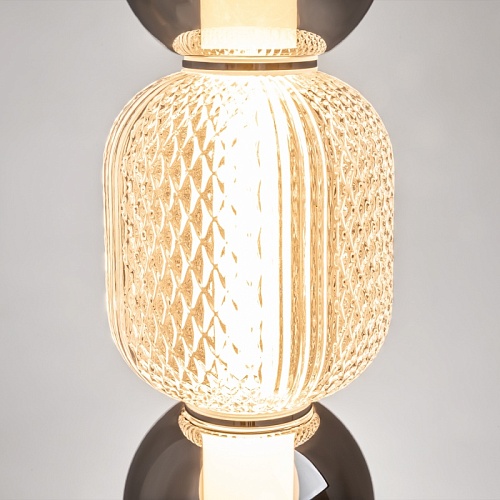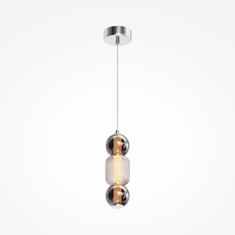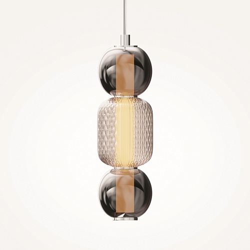 Материал арматуры - металл, цвета - золото, хром. Микс плафонов: гладкие cферы коньячного или дымчатого оттенка + округлые рельефные с ромбовидным узором из прозрачного стекла. Регулируемая высота подвесных моделей - максимальная длина провода 3 метра. LED-источник света, цветовая температура 3000К