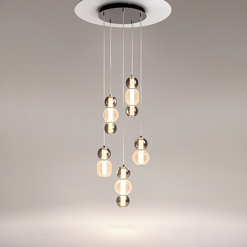 Материал арматуры - металл, цвета - золото, хром. Микс плафонов: гладкие cферы коньячного или дымчатого оттенка + округлые рельефные с ромбовидным узором из прозрачного стекла. Регулируемая высота подвесных моделей - максимальная длина провода 3 метра. LED-источник света, цветовая температура 3000К