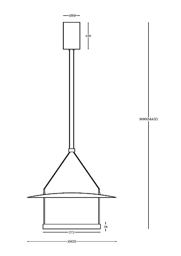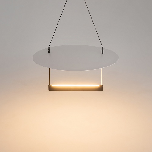 Арматура из алюминия, цвет - черный. Круглый и плоский металлический плафон, цвет - белый. Эффект отраженного и рассеянного света для основного освещения. Два диаметра рассеивателя. Регулируемая длина проводов - 3 метра. LED-источник света. Цветовая температура 3000К.