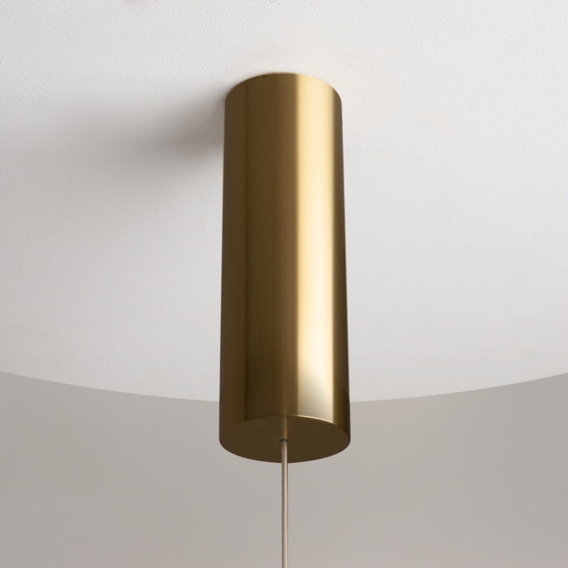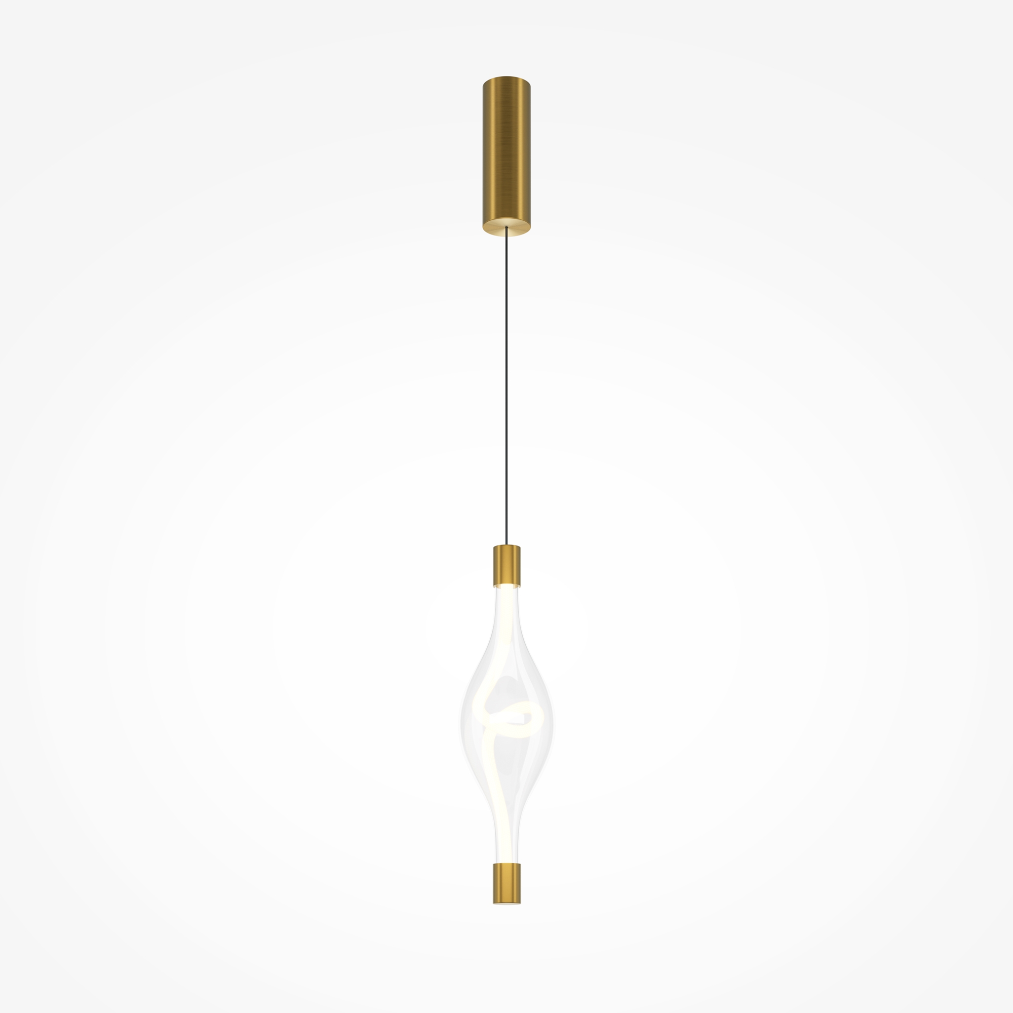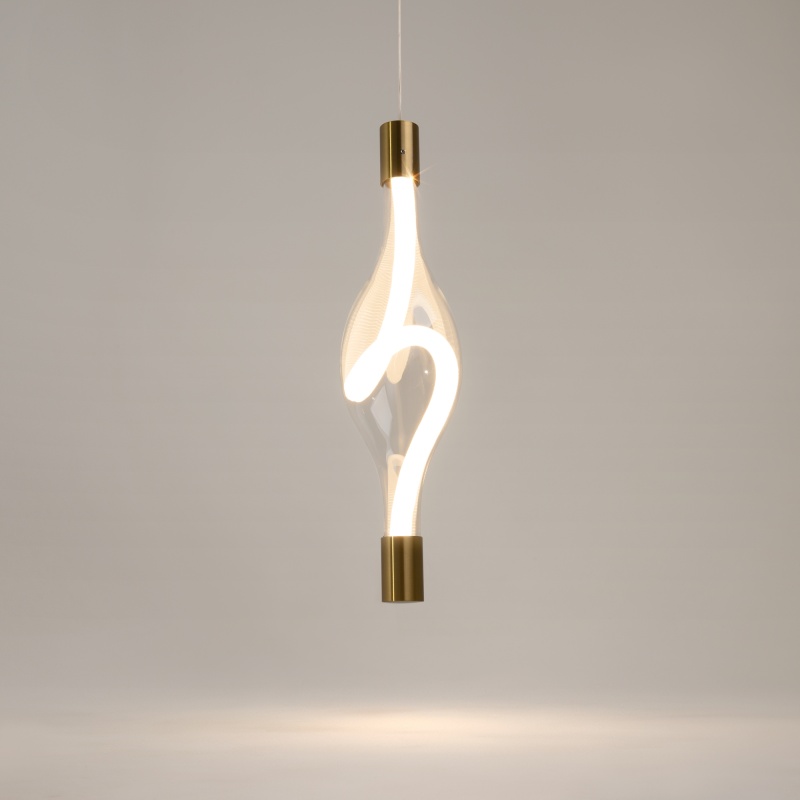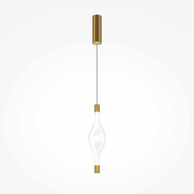 Арматура из металла в цвете латуни, плафоны — прозрачное стекло. LED-источник света в виде светодиодного тканевого шнура, цветовая температура 3000К и угол рассеивания 360°. Трендовая форма петли светодиодного шнура. Тросы подвесов регулируются по высоте до трех метров. Могут использоваться как основной источник света.