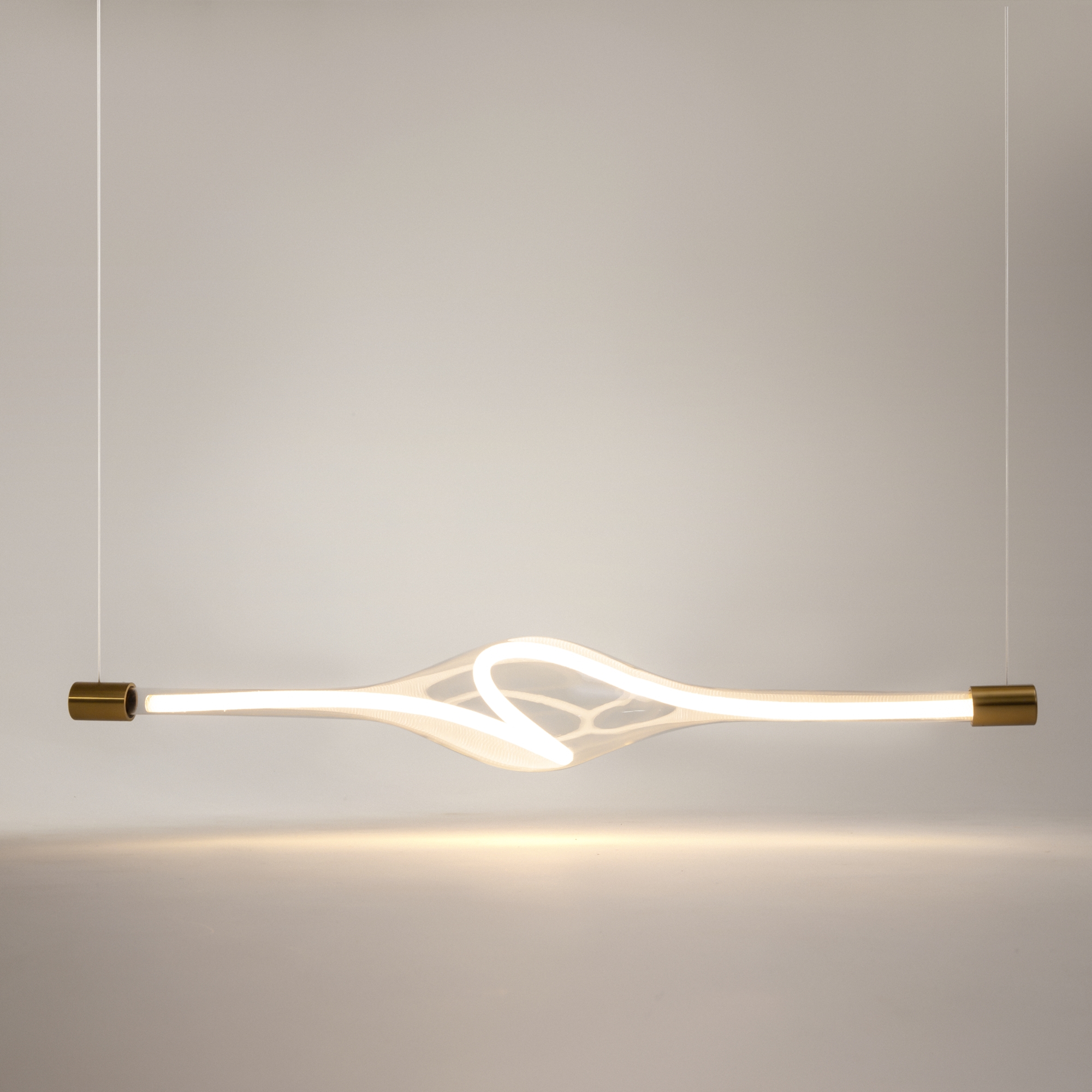 Арматура из металла в цвете латуни, плафоны — прозрачное стекло. LED-источник света в виде светодиодного тканевого шнура, цветовая температура 3000К и угол рассеивания 360°. Трендовая форма петли светодиодного шнура. Тросы подвесов регулируются по высоте до трех метров. Могут использоваться как основной источник света.