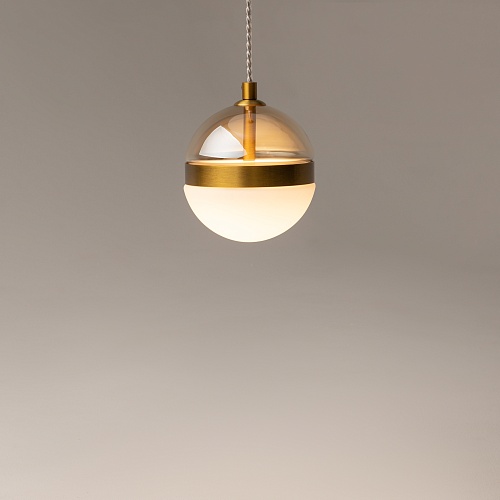 Черная потолочная чаша дополнена финишным антибликовым покрытием sandy, декоративный элемент плафона выполнен из металла цвета сатинированной латуни. Сочетание двух фактурных стекол в плафоне: нижняя полусфера из матового белого стекла для создания мягкого рассеянного света, верхняя часть плафона - из тонированного янтарного стекла. Внутри установлен LED-модуль, создающий равномерное освещение, направленное вверх и вниз. Цветовая температура – 3000К, угол рассеивания — 120°.