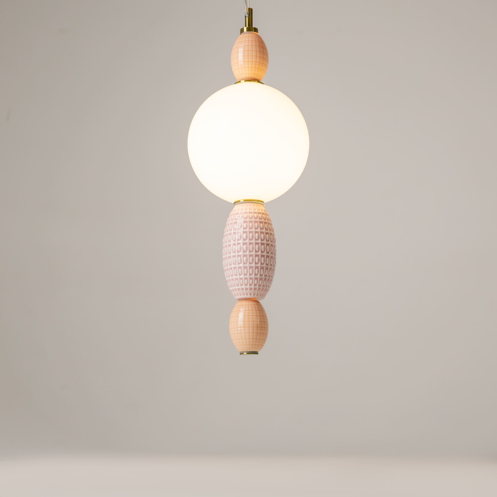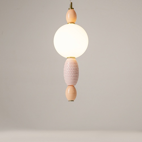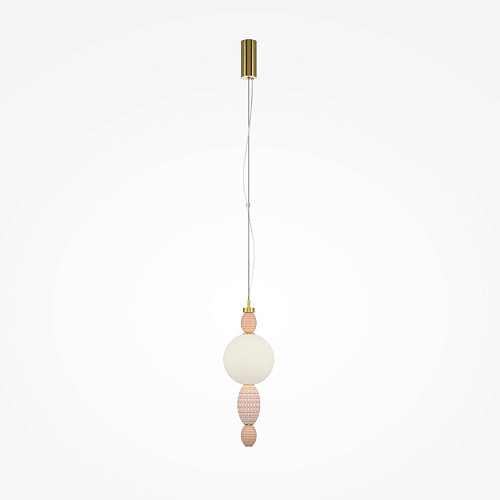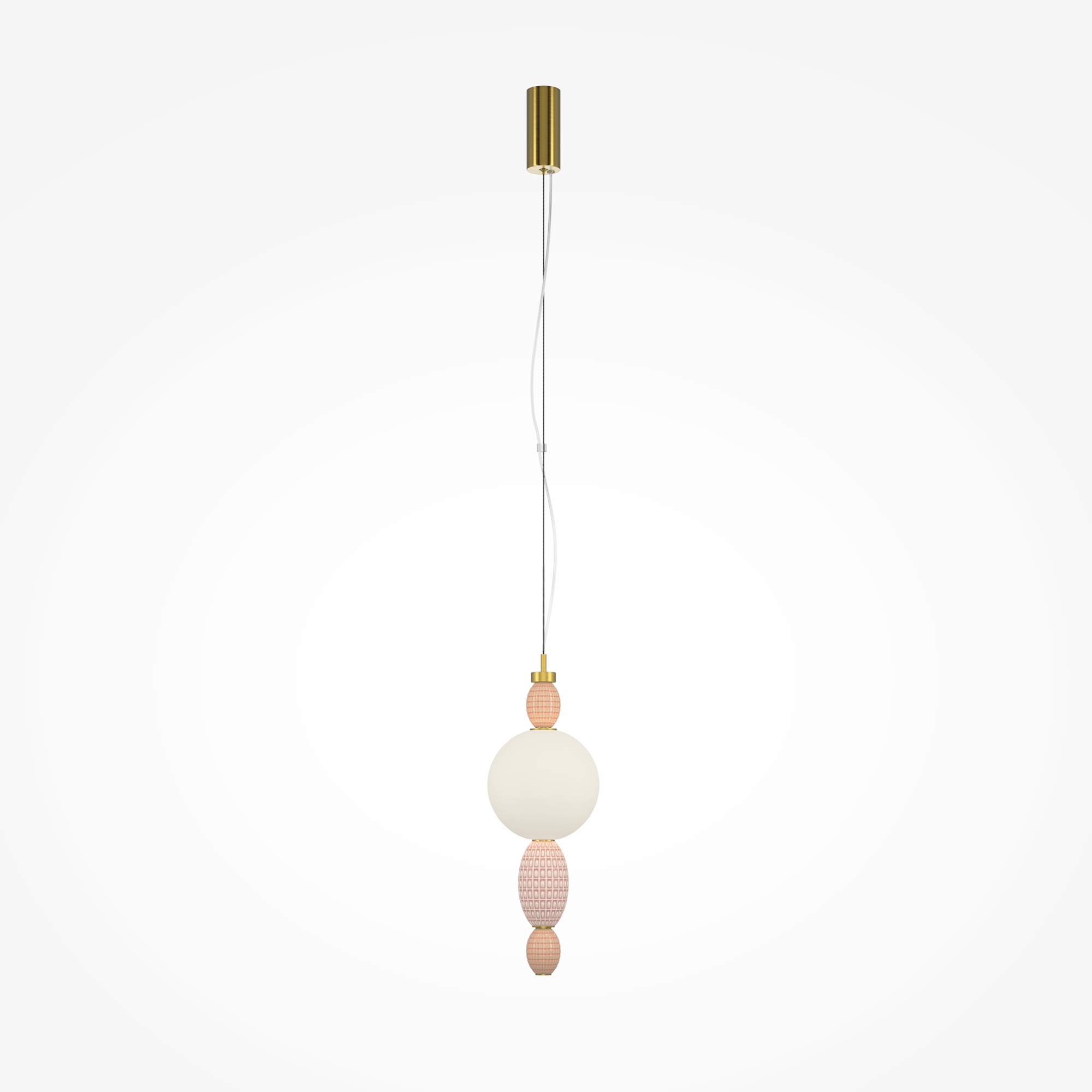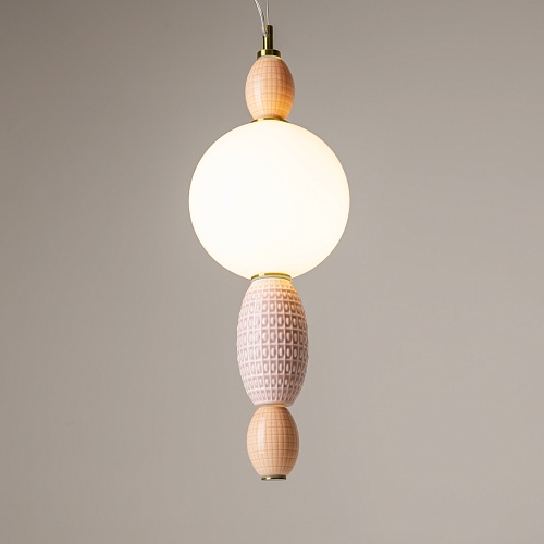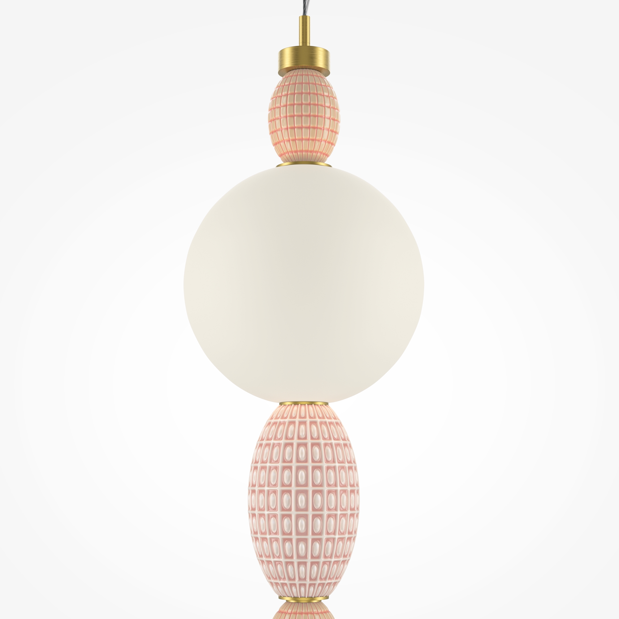 Металлическая арматура цвета латуни. Плафоны из белого стекла для мягкого, равномерного освещения, декоративные элементы из цветной керамики. Угол рассеивания 120°. Цветовая температура – 3000 К. Регулируемый провод длиной 3 м.