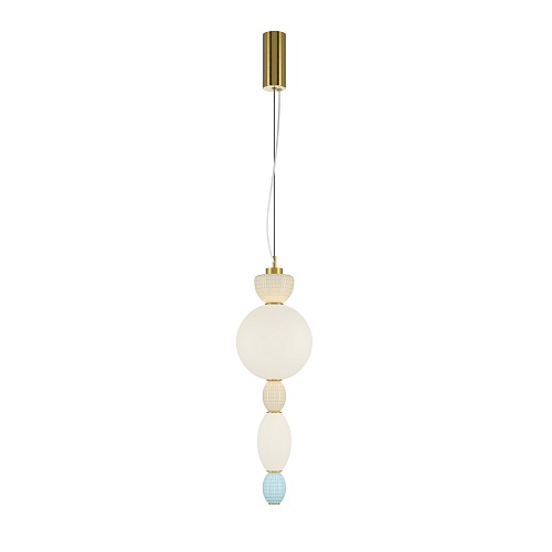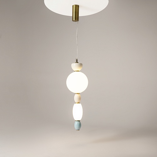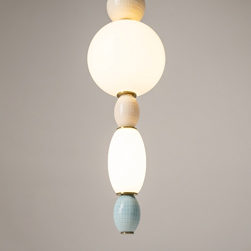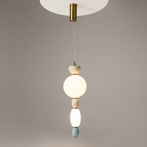 Металлическая арматура цвета латуни. Плафоны из белого стекла для мягкого, равномерного освещения, декоративные элементы из цветной керамики. Угол рассеивания 120°. Цветовая температура – 3000 К. Регулируемый провод длиной 3 м.