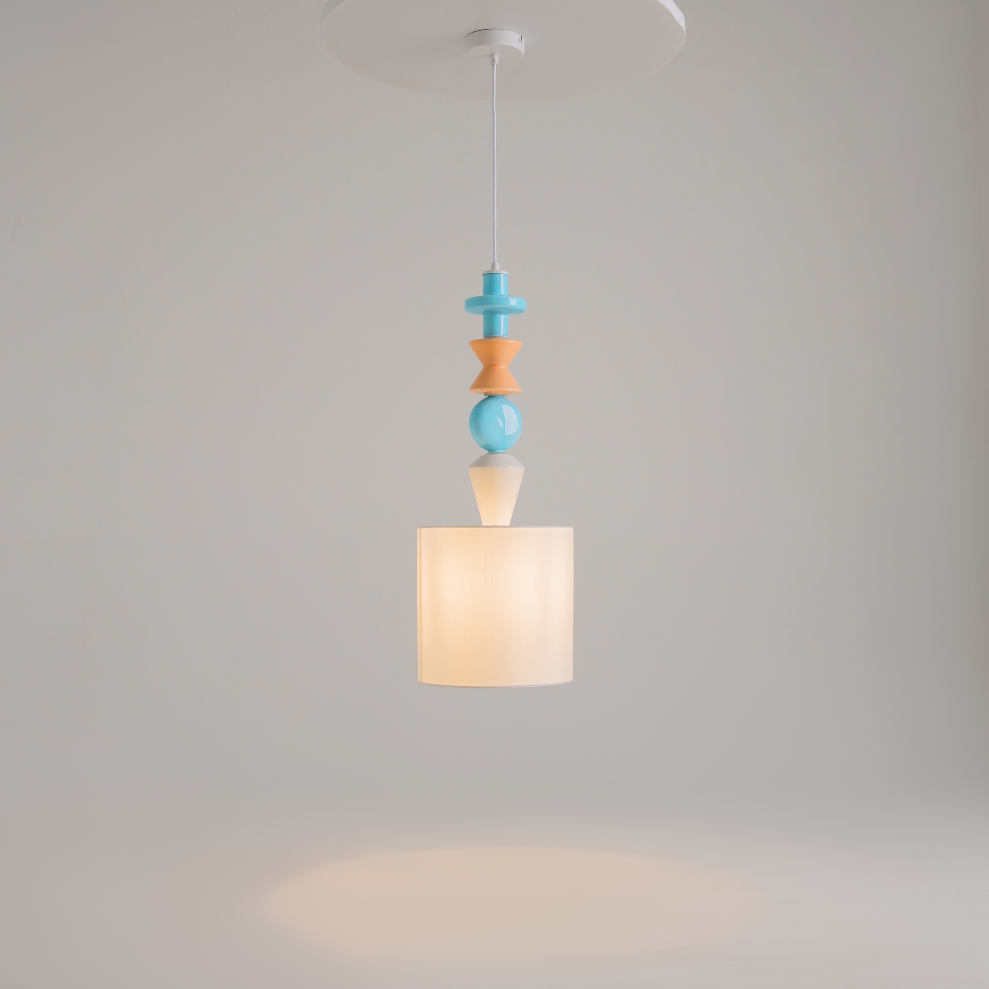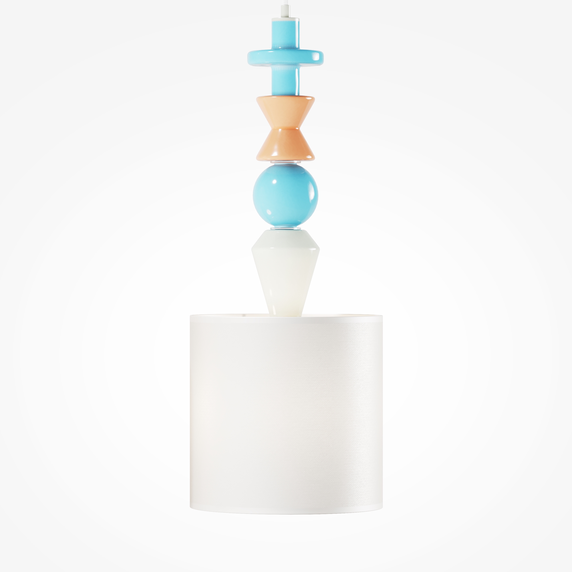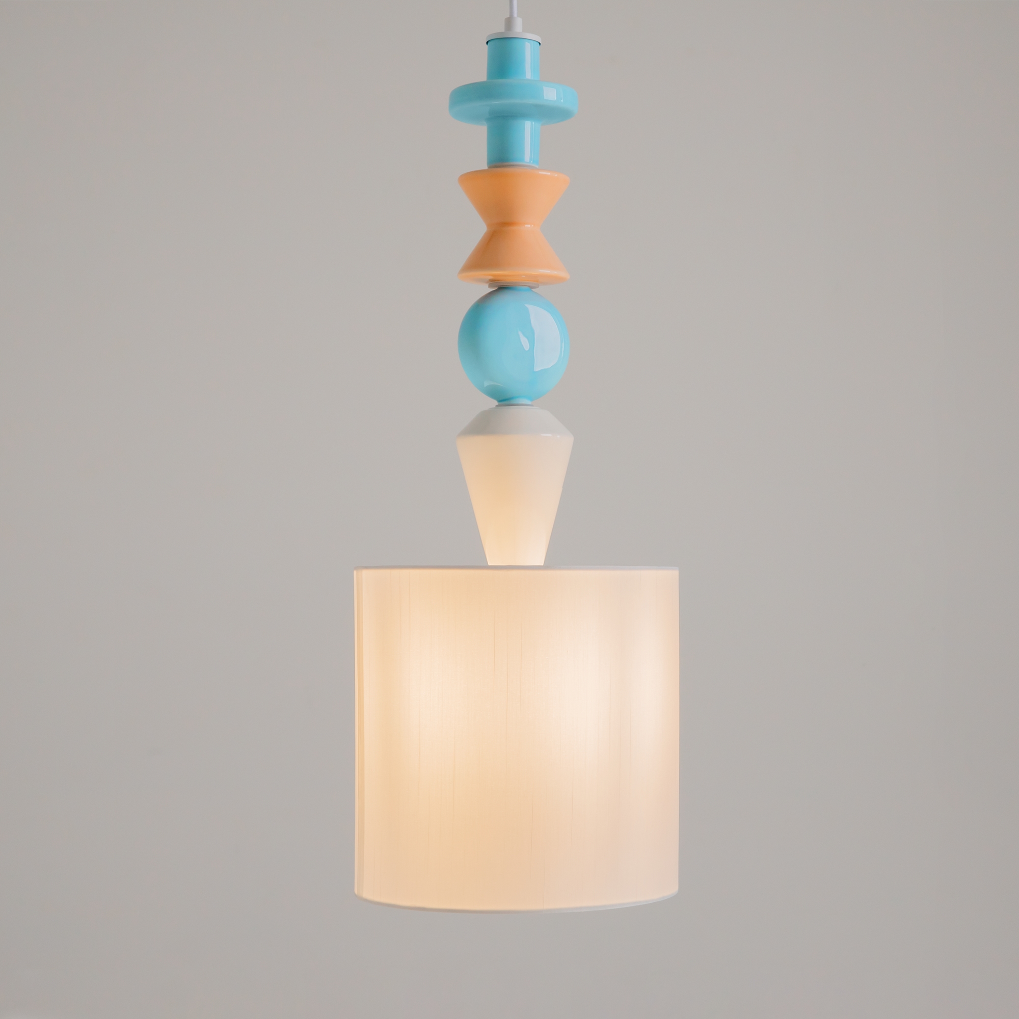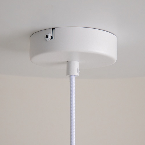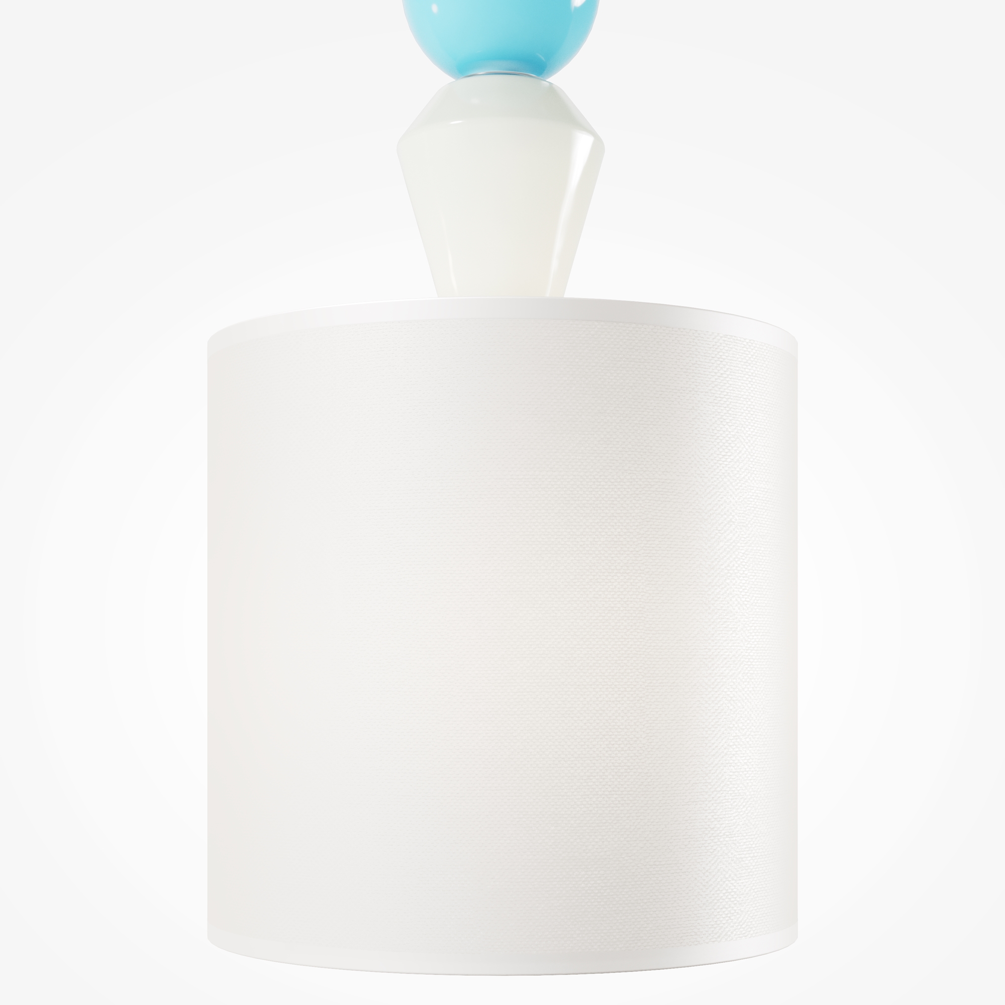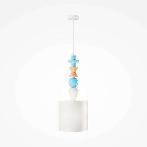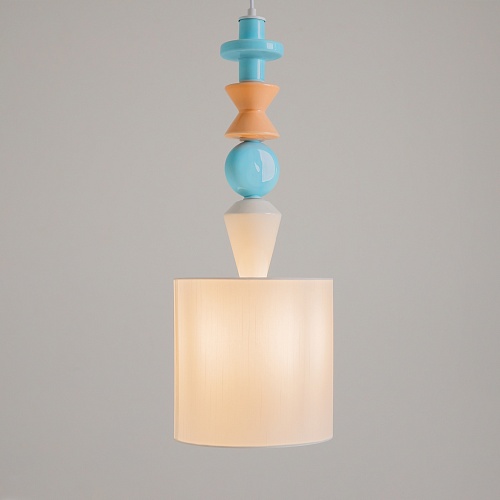 Арматура из металла, цвет - белый. Абажур выполнен из натуральной ткани, цветные декоративные элементы в пастельных тонах — из керамики. Белый абажур имеет классическую цилиндрическую форму, ткань дает мягкий рассеянный свет. Светильники комплектуются сменными лампами с цоколем Е27 (не входят в комплект). Провод подвесного светильника можно регулировать по длине. Декор напоминает стилистику крафтового искусства