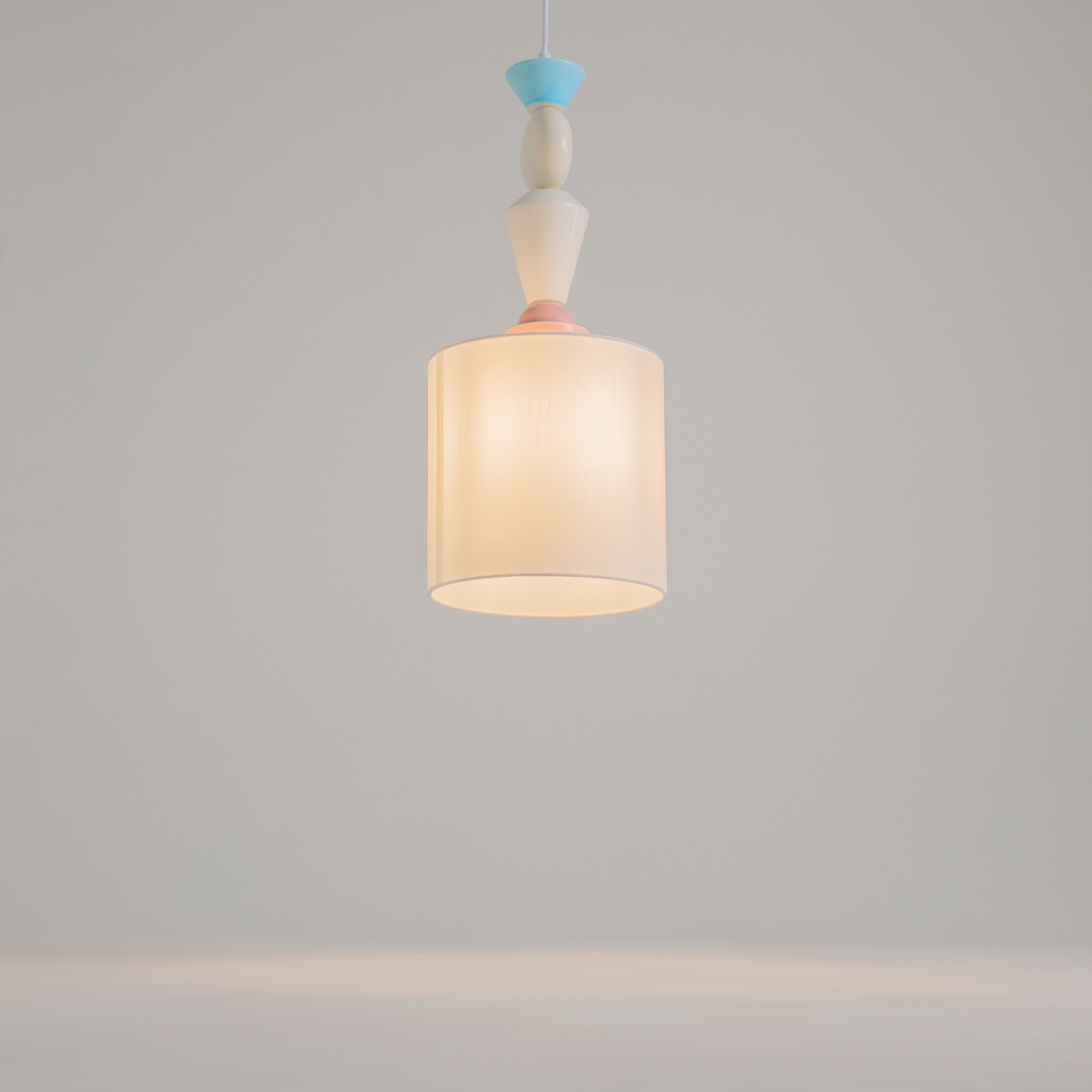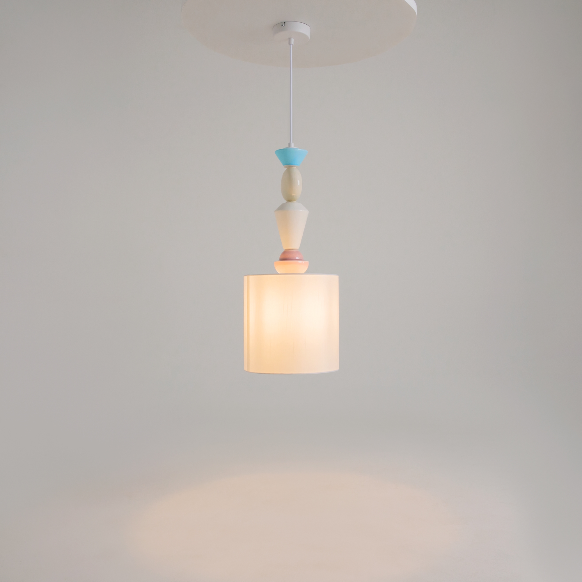 Арматура из металла, цвет - белый. Абажур выполнен из натуральной ткани, цветные декоративные элементы в пастельных тонах — из керамики. Белый абажур имеет классическую цилиндрическую форму, ткань дает мягкий рассеянный свет. Светильники комплектуются сменными лампами с цоколем Е27 (не входят в комплект). Провод подвесного светильника можно регулировать по длине. Декор напоминает стилистику крафтового искусства